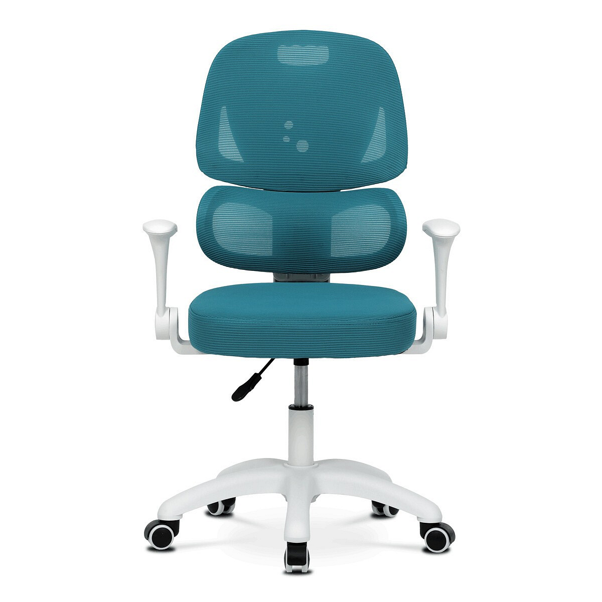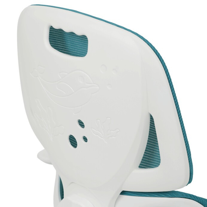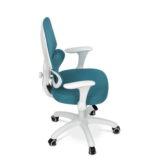 Dětská židle s modrou síťovinou nabízí pohodlné a vzdušné sezení díky prodyšnému materiálu, který podporuje cirkulaci vzduchu. Opěradlo je vybaveno výškově nastavitelnou bederní opěrkou, která zajišťuje správnou podporu spodní části zad, a výškově nastavitelným opěrákem pro individuální přizpůsobení. Odklápěcí područky umožňují snadnější přístup k pracovnímu prostoru a zároveň šetří místo. Plastový bílý kříž zajišťuje stabilitu a lehkost celé židle, zatímco kolečka jsou vhodná pro tvrdé podlahy, což usnadňuje pohyb po místnosti. Výškově nastavitelný sedák umožňuje optimální přizpůsobení výšky sezení podle potřeby dítěte.