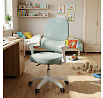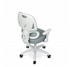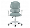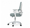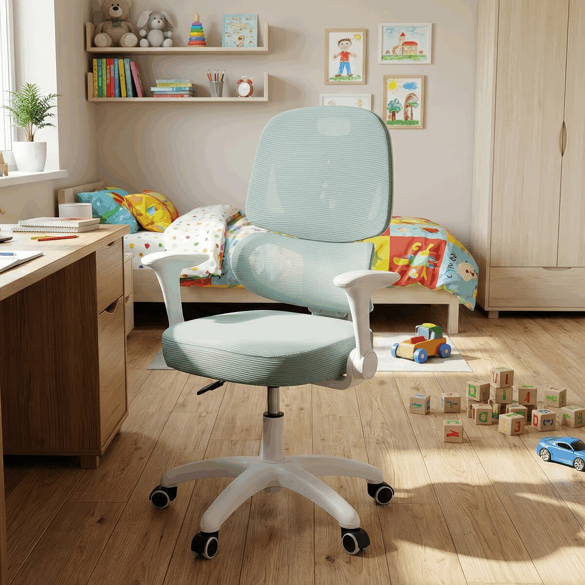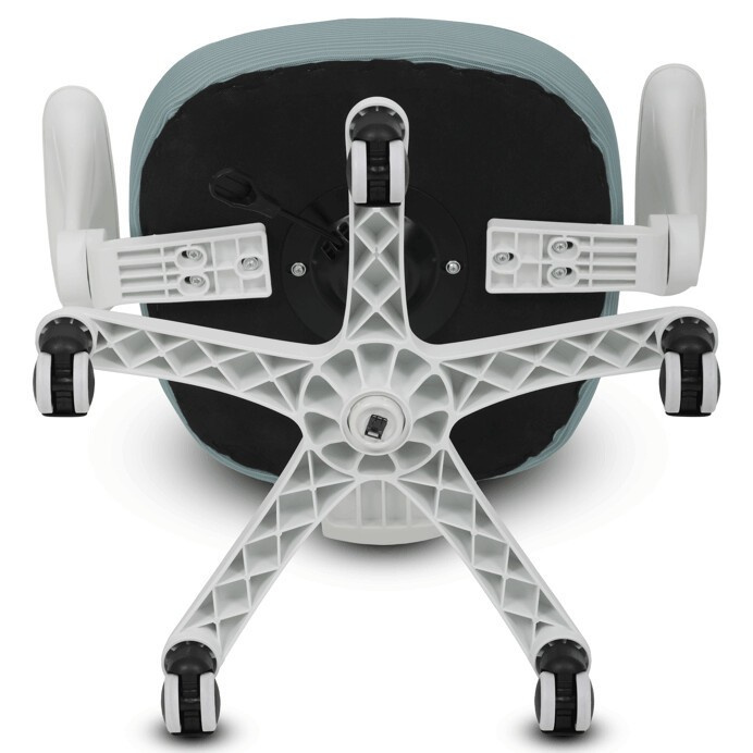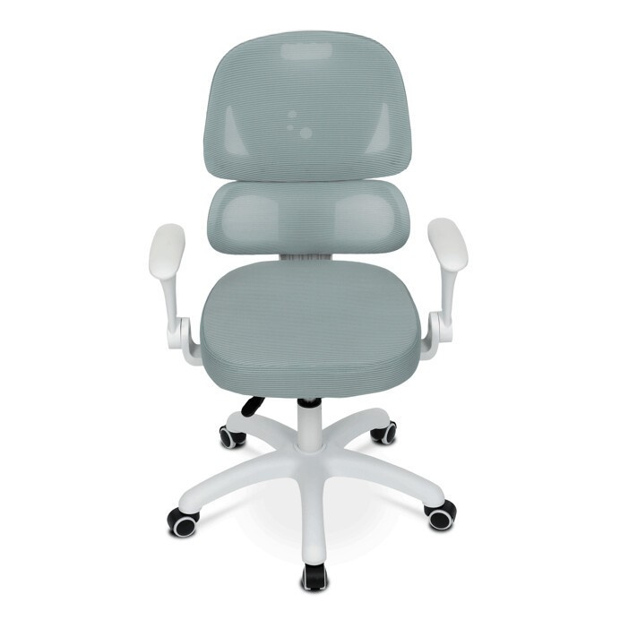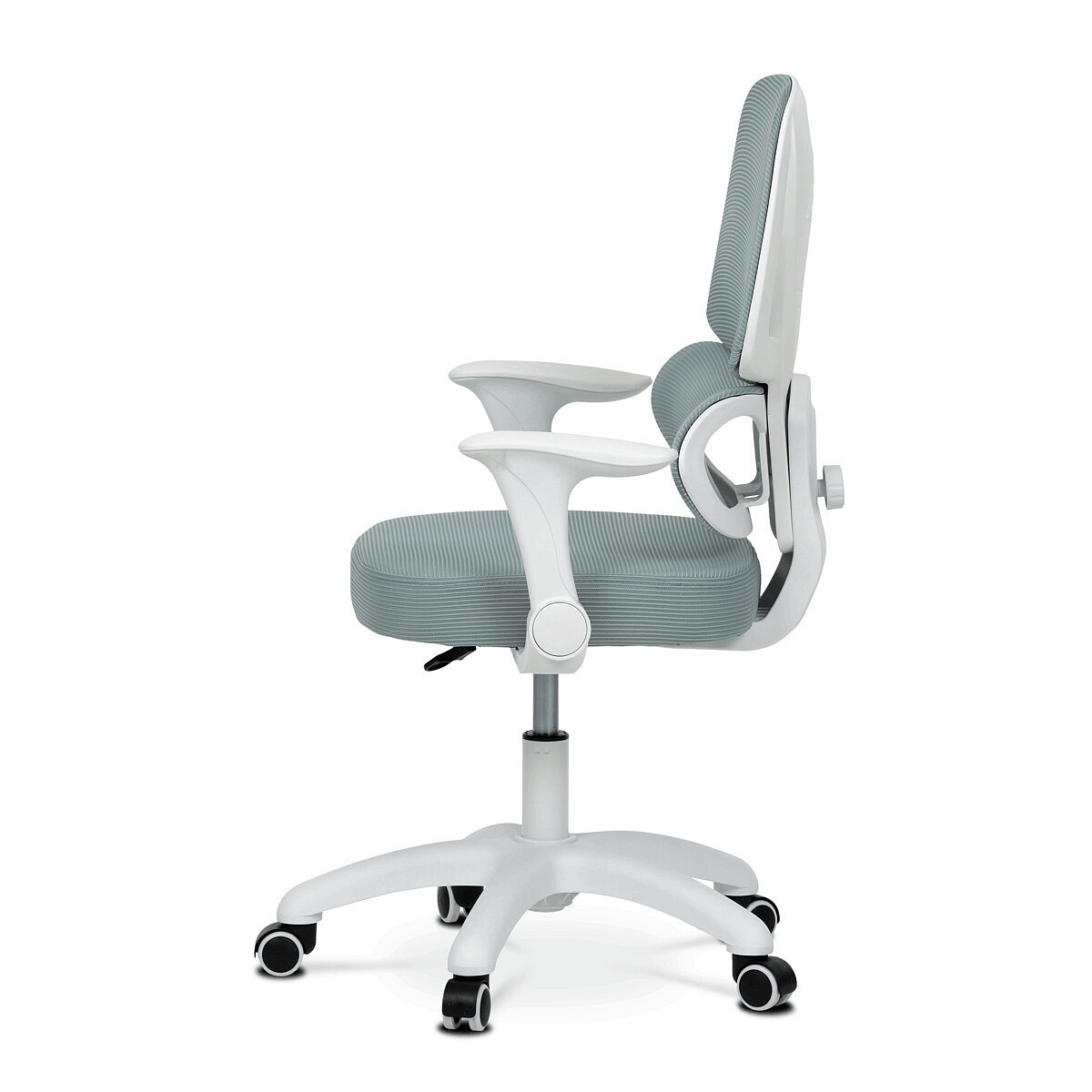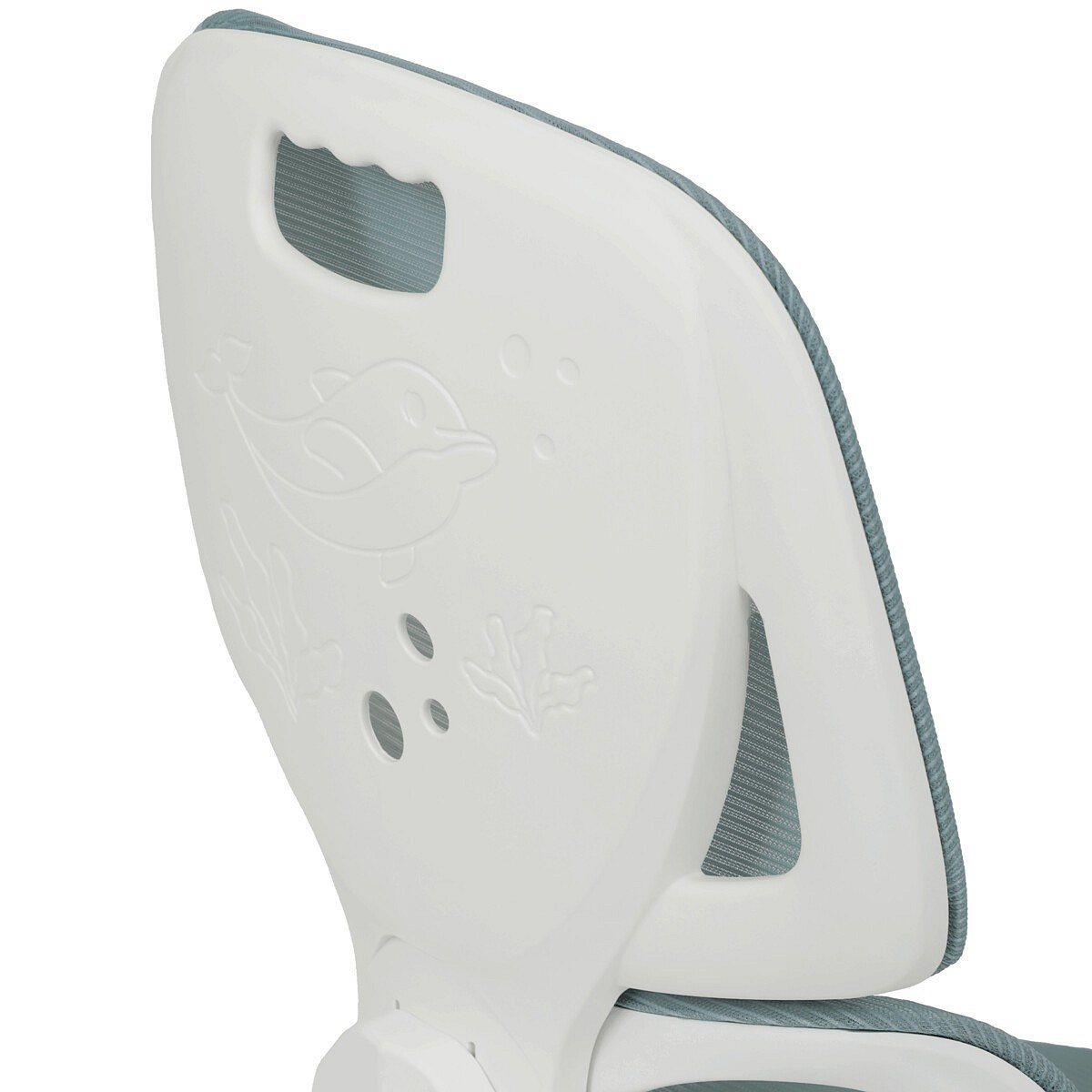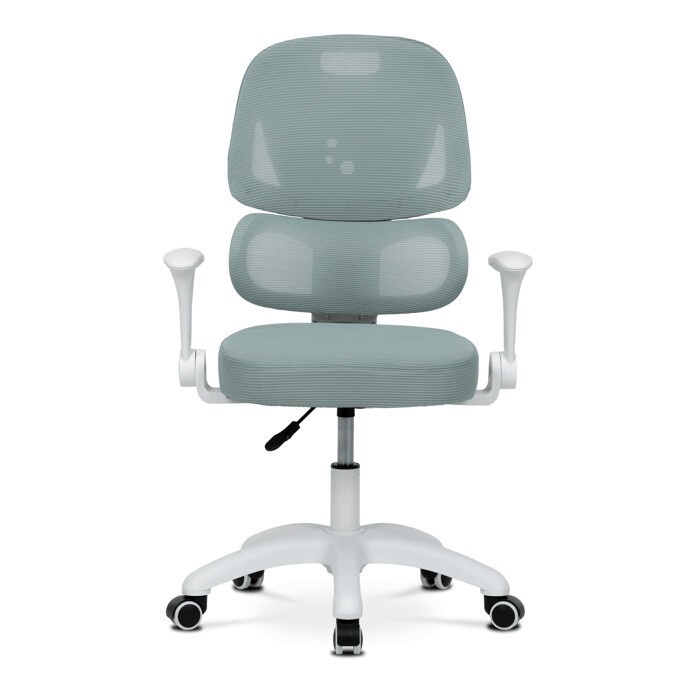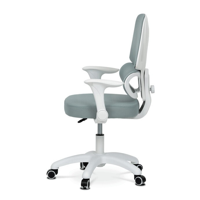 Dětská židle s konstrukcí z bíle plastového kříže a kolečky určenými pro tvrdé podlahy nabízí stabilní a bezpečné sezení. Opěradlo i sedák jsou potaženy zelenou prodyšnou síťovinou, která zajišťuje komfortní cirkulaci vzduchu během používání. Výškově nastavitelný opěrák a sedák umožňují přizpůsobení židle aktuálním potřebám dítěte, zatímco odklápěcí područky přispívají k větší flexibilitě a snadnému přístupu ke stolu. Integrovaná bederní opěrka podporuje správné držení těla a přispívá k ergonomii sezení. Díky těmto vlastnostem je židle vhodná pro dlouhodobé používání v dětském pokoji nebo pracovně.
