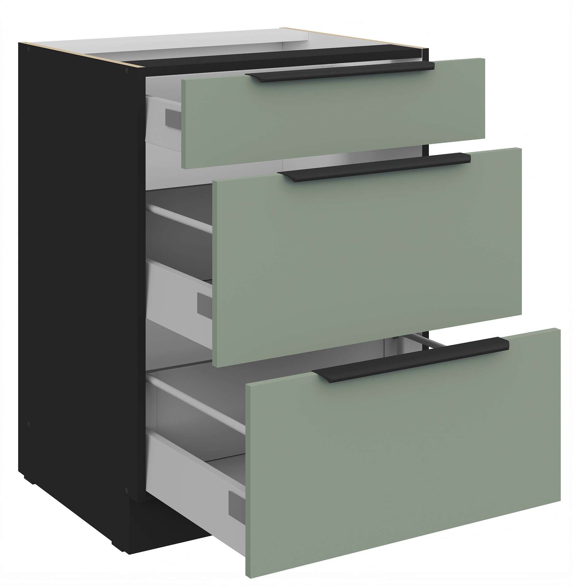 Kuchyňské skřínky ARIA jsou vybaveny černými úchyty typu UA-HEXA s roztečí 64 mm - 320 mm, vyrobenými z hliníku, které dokonale ladí s celkovým designem. Panty s tichým dovíráním přispívají k pohodlnému a tichému používání. Zadní strana skříněk je z bílého HDF materiálu o tloušťce 2,5 mm, což zajišťuje stabilitu a pevnost konstrukce.