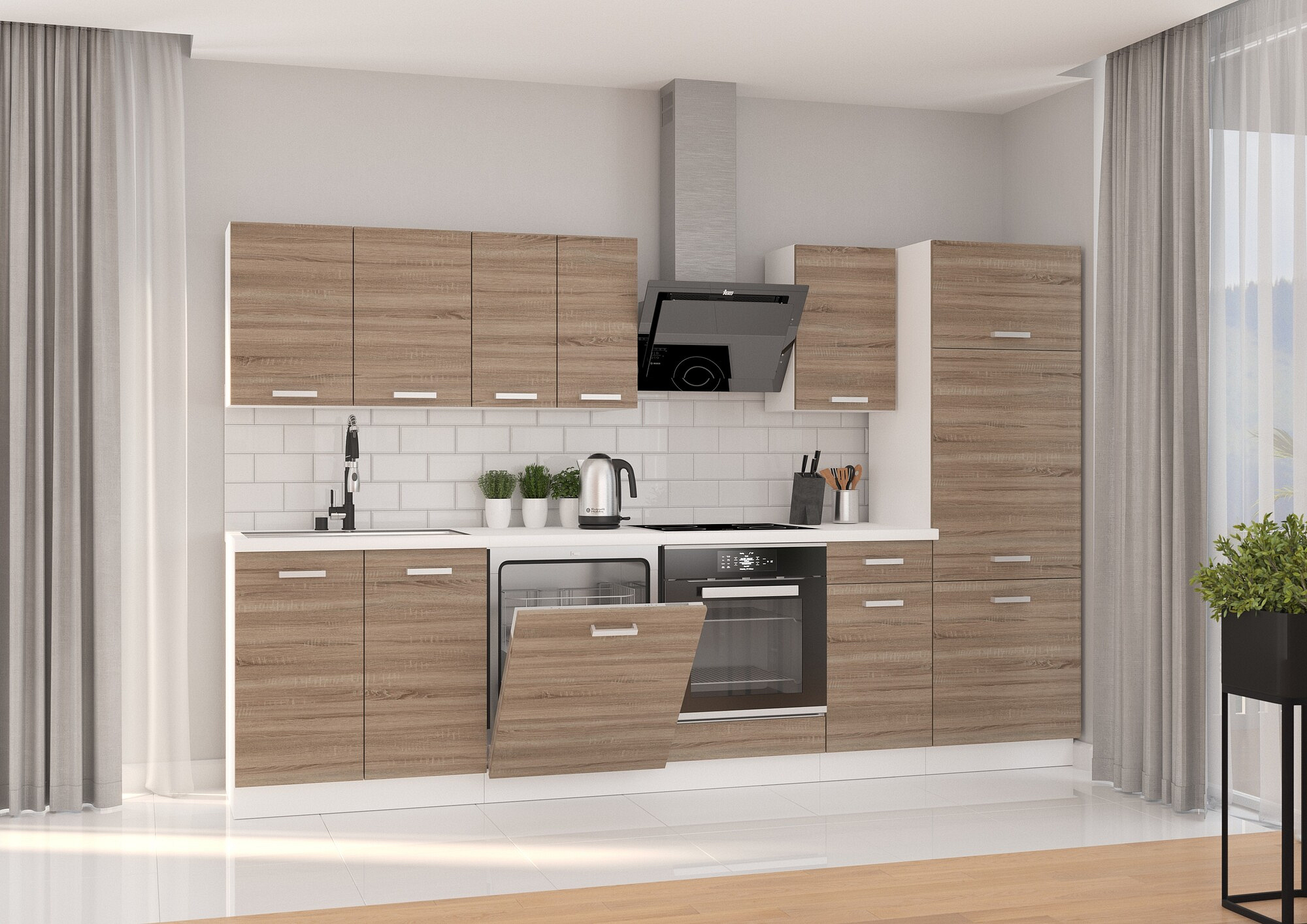 Kuchyně má univerzální dvířka, která lze instalovat jako pravá nebo levá, což zajišťuje maximální flexibilitu při montáži. Vnitřek skříněk je v bílém provedení, což usnadňuje orientaci a přehlednost.