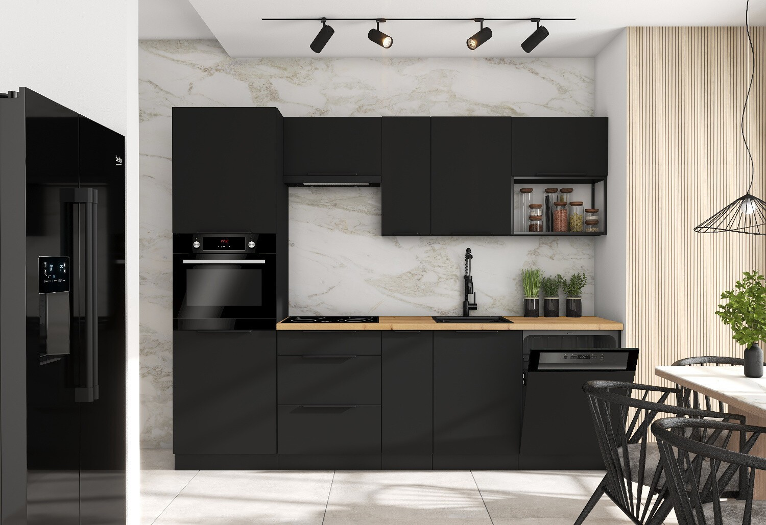 - Dvířka a čela šuplíků jsou vyrobeny z LTD desky výšky 16 mm v barvě Černá mat