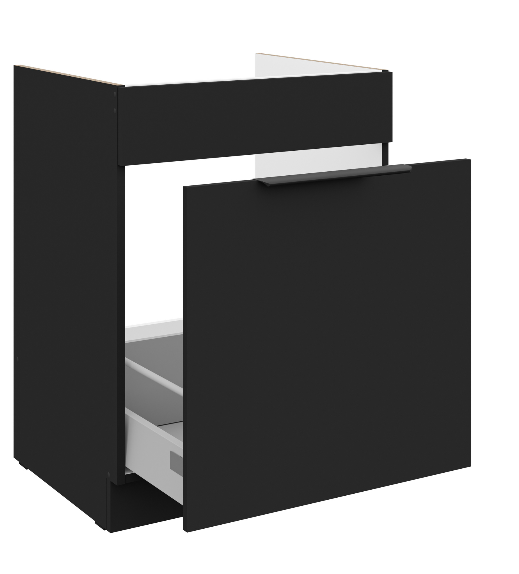 - Dvířka a čela šuplíků jsou vyrobeny z LTD desky výšky 16 mm v barvě Černá mat