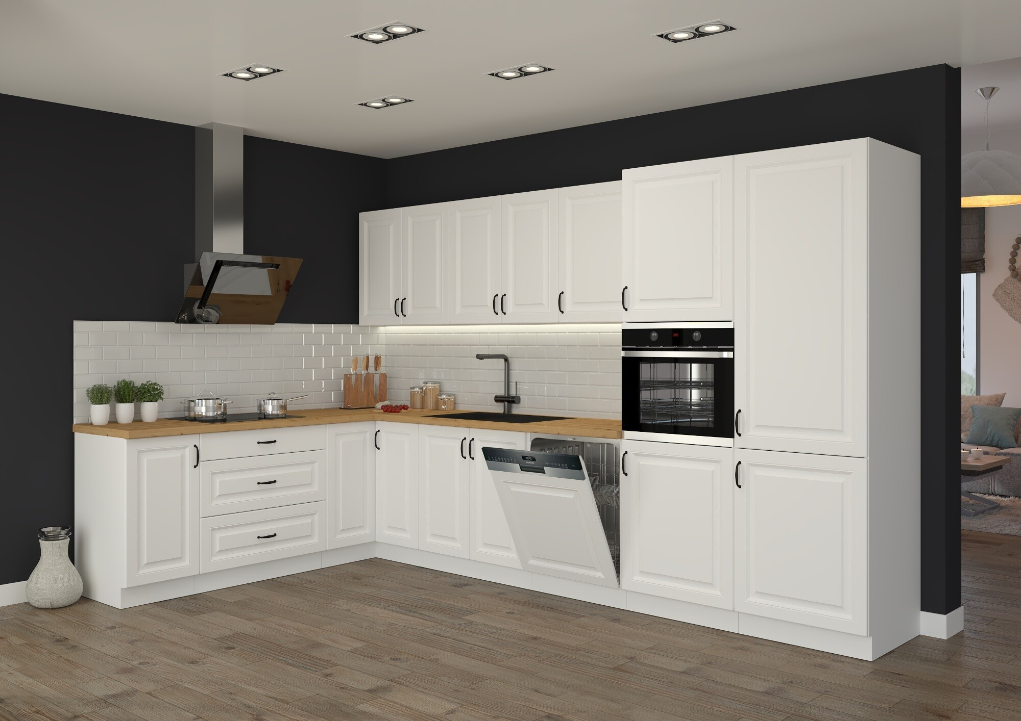 - Dvířka horních, dolních skřínek a dvířka vysokých skříní jsou universální (Pravé/Levé)