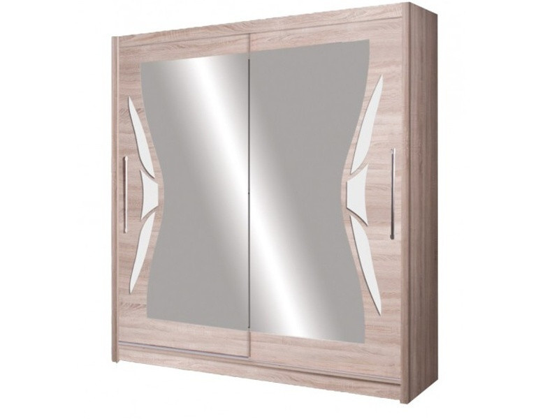 DOME šatní skříň s posuvnými dveřmi hodící se ke stejnojmenné ložnici. Skříně se vyrábí i v šíři 200 cm. Barva provedení v dubu Sonoma v kombinaci s bílým leskem.