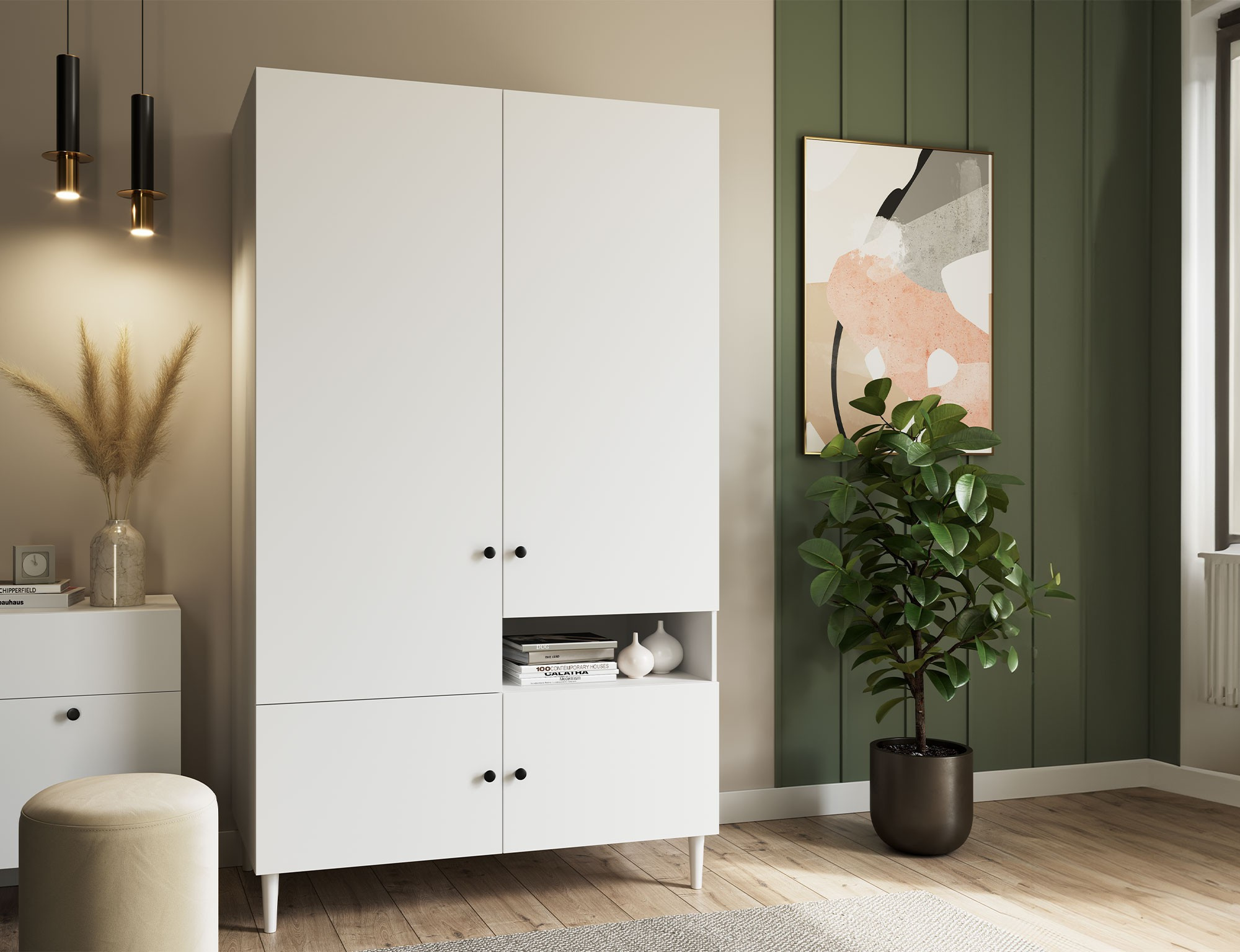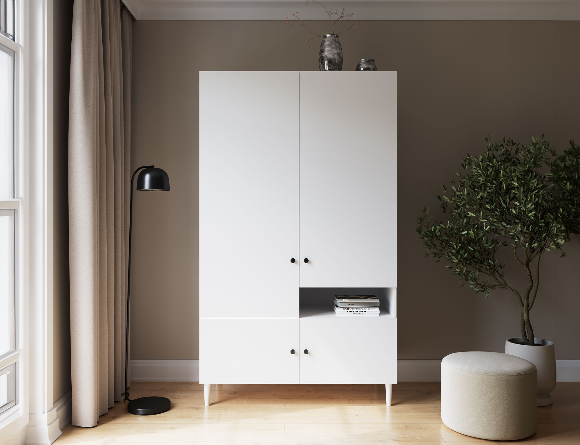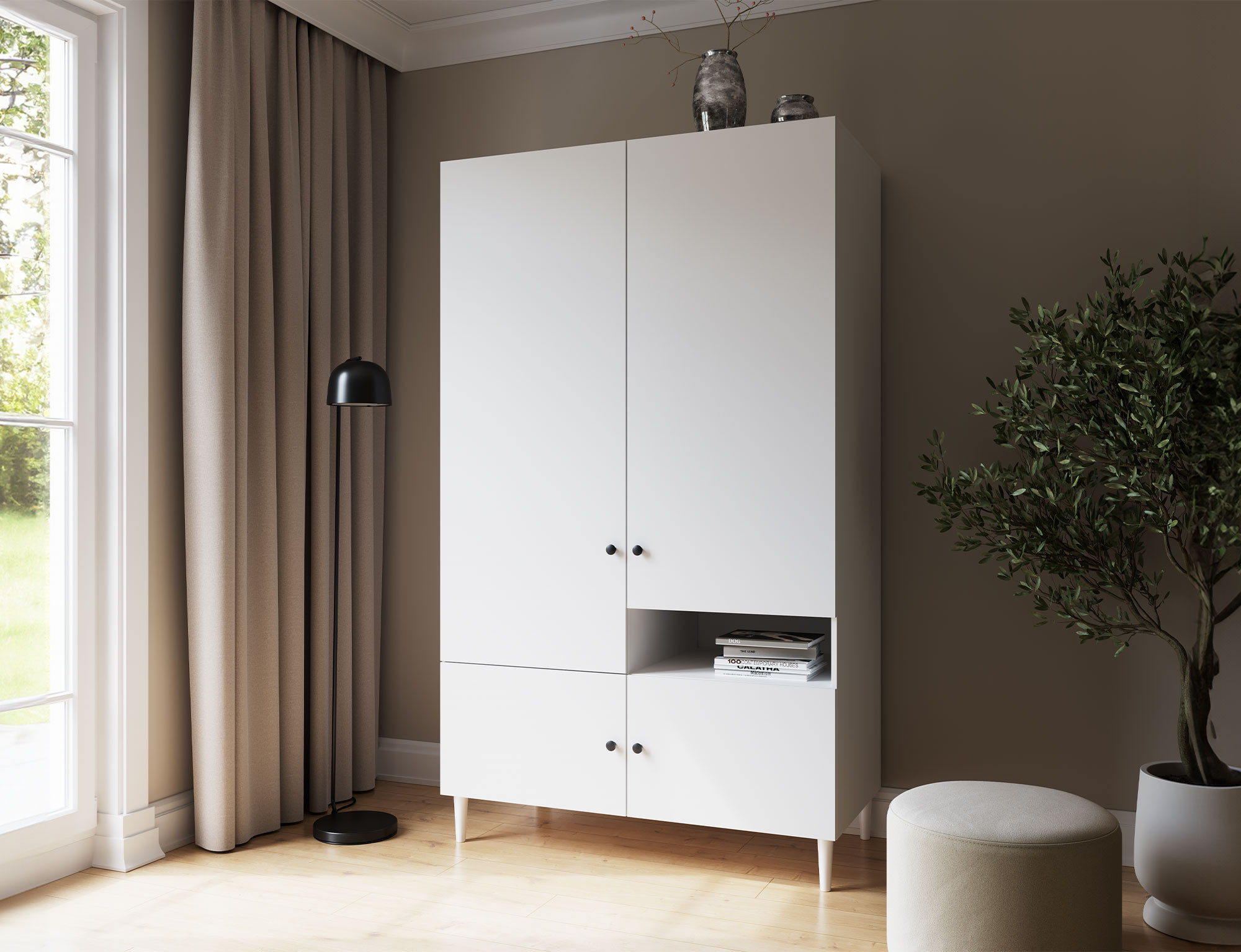The Dullum wardrobe is an elegant and spacious piece of furniture with dimensions of 120x205x60cm. It features sturdy wooden legs that are 15 cm high, providing stability and a stylish appearance. Its generous design offers ample space for storing clothes and other items, while its sophisticated finish ensures it complements various interior styles, adding a modern touch.