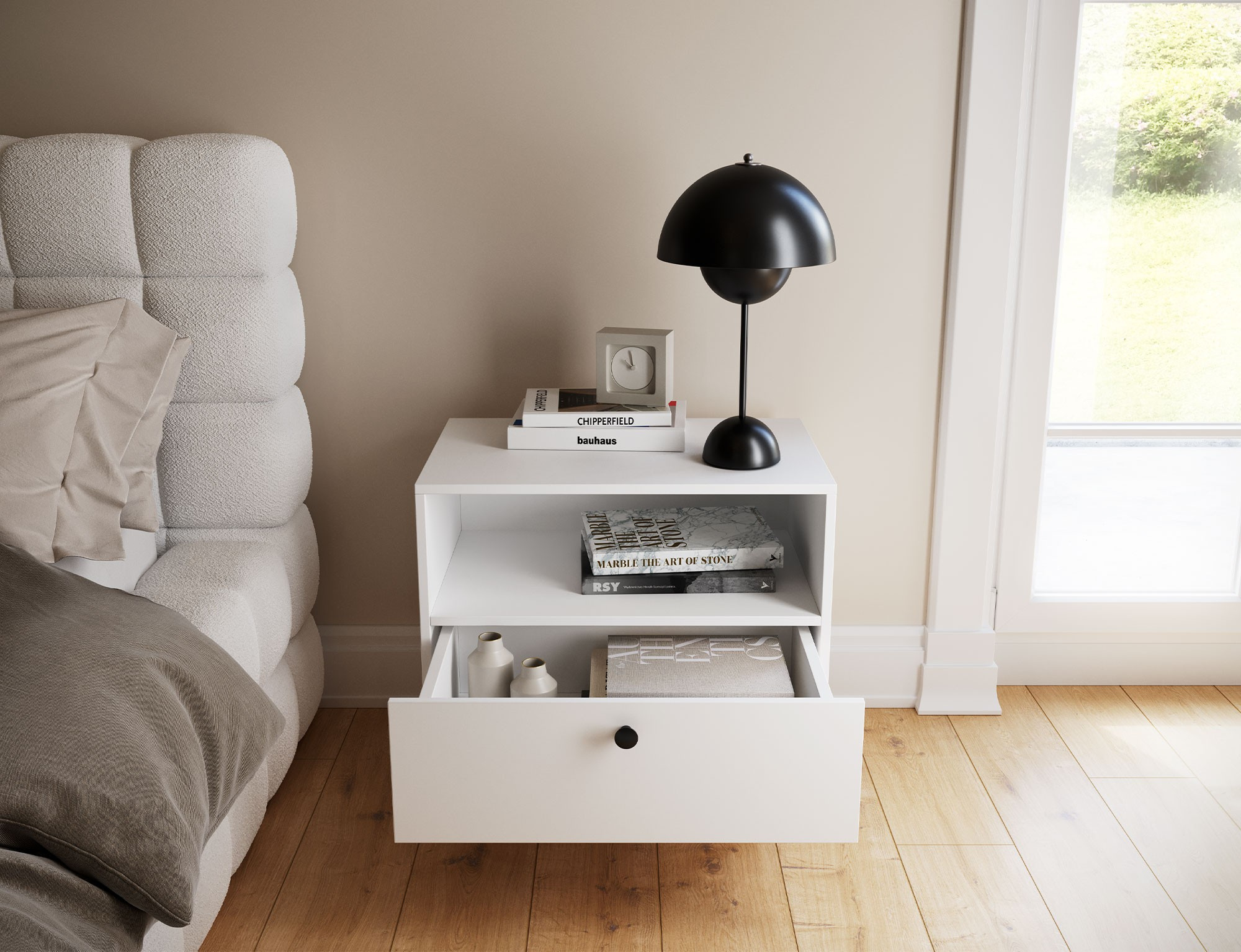 The Dullum nightstand is a functional and stylish piece of furniture with dimensions of 60 cm in width, 55 cm in height, and 40 cm in depth. It features one open shelf and one drawer, providing practical storage space for essential items. Its elegant design ensures it fits seamlessly into any interior, adding a touch of modern character.