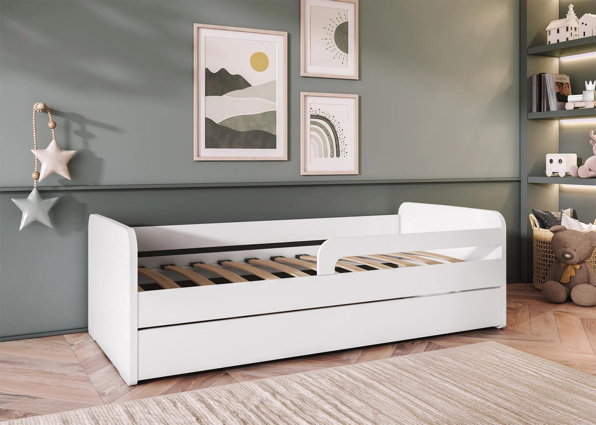 The Duuli children's bed is a modern piece of furniture with a universal design that fits perfectly into any child's room interior. The sturdy frame in a classic white color adds lightness and elegance, emphasizing its timeless character. The bed is equipped with a safety rail that ensures complete security during sleep, protecting the child from accidental falls. Available in two options – with or without a mattress – it allows customization to individual needs. The lack of a bedding container makes the construction light, simple, and perfectly suited to a minimalist, modern style. The Duuli bed combines aesthetics, functionality, and safety, making it an ideal solution for your child's comfortable rest.