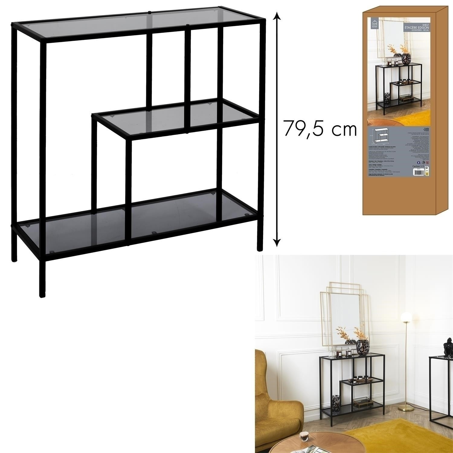 Az Edison polc egy fekete fém szerkezet és füstös árnyalatú üvegpolcok kombinációja. A polcok edzett üvege nemcsak biztonságos anyag, hanem könnyen tisztán tartható is. Az aszimmetrikus kialakítású polc nemcsak jó hely a könyvek, szuvenírek vagy virágok számára. Ez is működni fog, mint egy elem, amely elválasztja a nappalit az étkezőtől egy kisebb belső térben. A polc saját összeszerelést igényel. Maximális terhelés polconként 5 kg. Kartondoboz méretei: 37x14x91,5 cm. A polc tömege 12 kg
