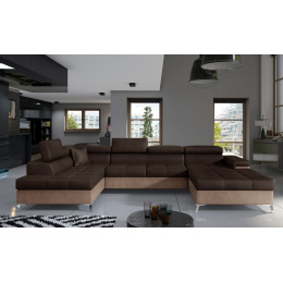 Eduardo is an original tasteful and exceptionally soft corner sofa, which brings a breath of freshness and luxury to the interior in which it is placed. The furniture, measuring 345 x 202 x 90 cm, guarantees maximum comfort for daytime rest, as well as for relaxation at night, as it is equipped with a sleeping function with an area designed for this - 125 x 265 cm. The dolphin mechanism also comes to the fore here, which intuitively and effortlessly unfolds the furniture to the desired position. Among other conveniences we can include a spacious bedding container located in the ottoman, as well as a comfortable seat made of HR foam that best adapts to our body during sleep. Other unique features of the corner sofa include: adjustable headrests, wide armrests, and high metal legs. The Eduardo corner sofa is available in a full range of fabrics from the Eltap pattern book, which allows you to arrange your interior in a very individual way.