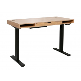 MÉRETEK: - mélység: 60 cm - szélesség: 120 cm - magasság (elektromosan állítható): 76-122 cm ANYAG: - lap: MDF + furnér - keret: porfestett fém SZÍN: - lap: természetes tölgy - keret: fekete EGYÉB: - fokozatmentes elektromos magasságállítás - csendes elektromos motor - két polc és egy fiók - állítható lábak - kábelrendező (a lap alatt) - kábelátvezető (a lapon) - három USB port (a lapon)