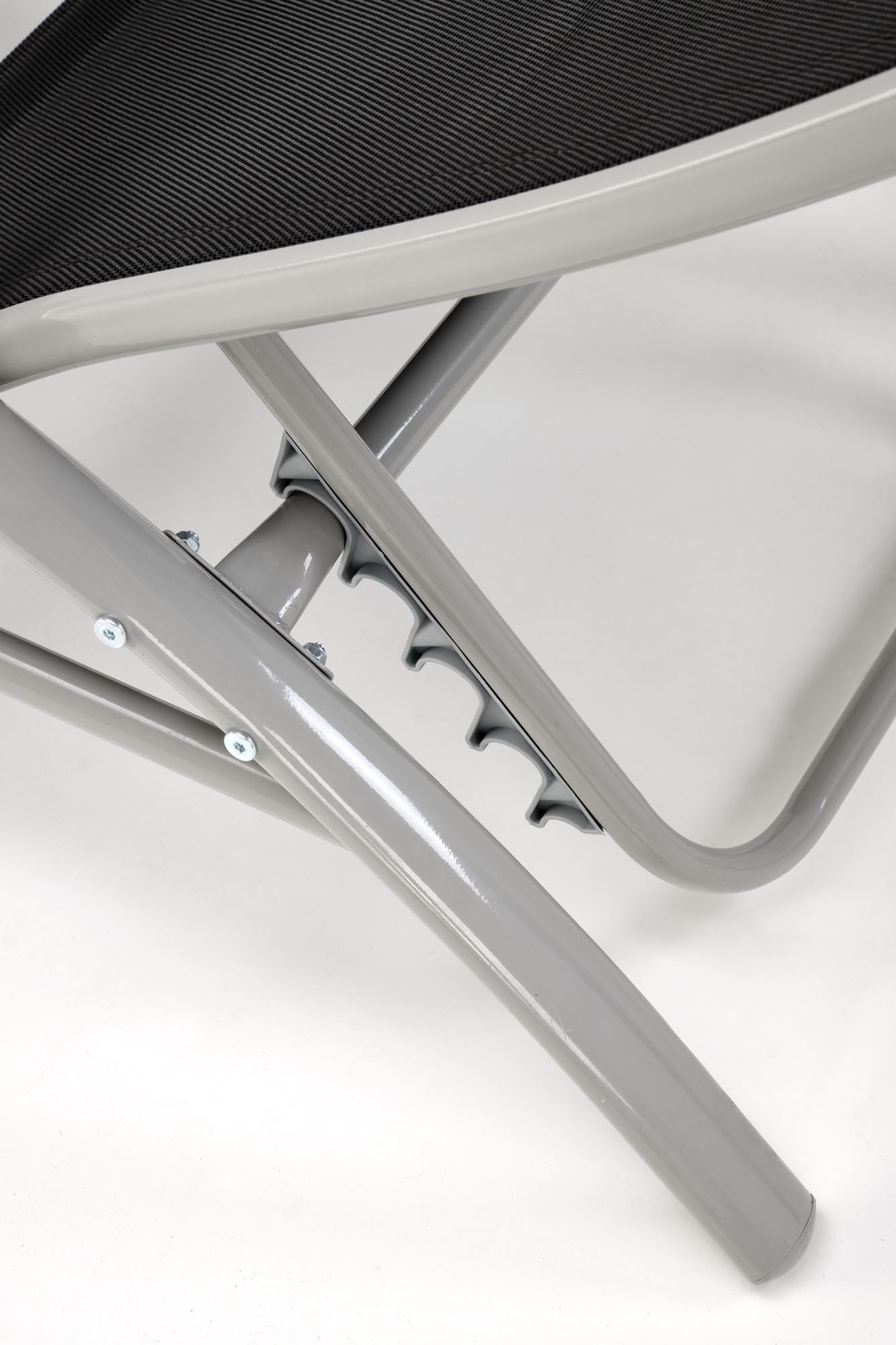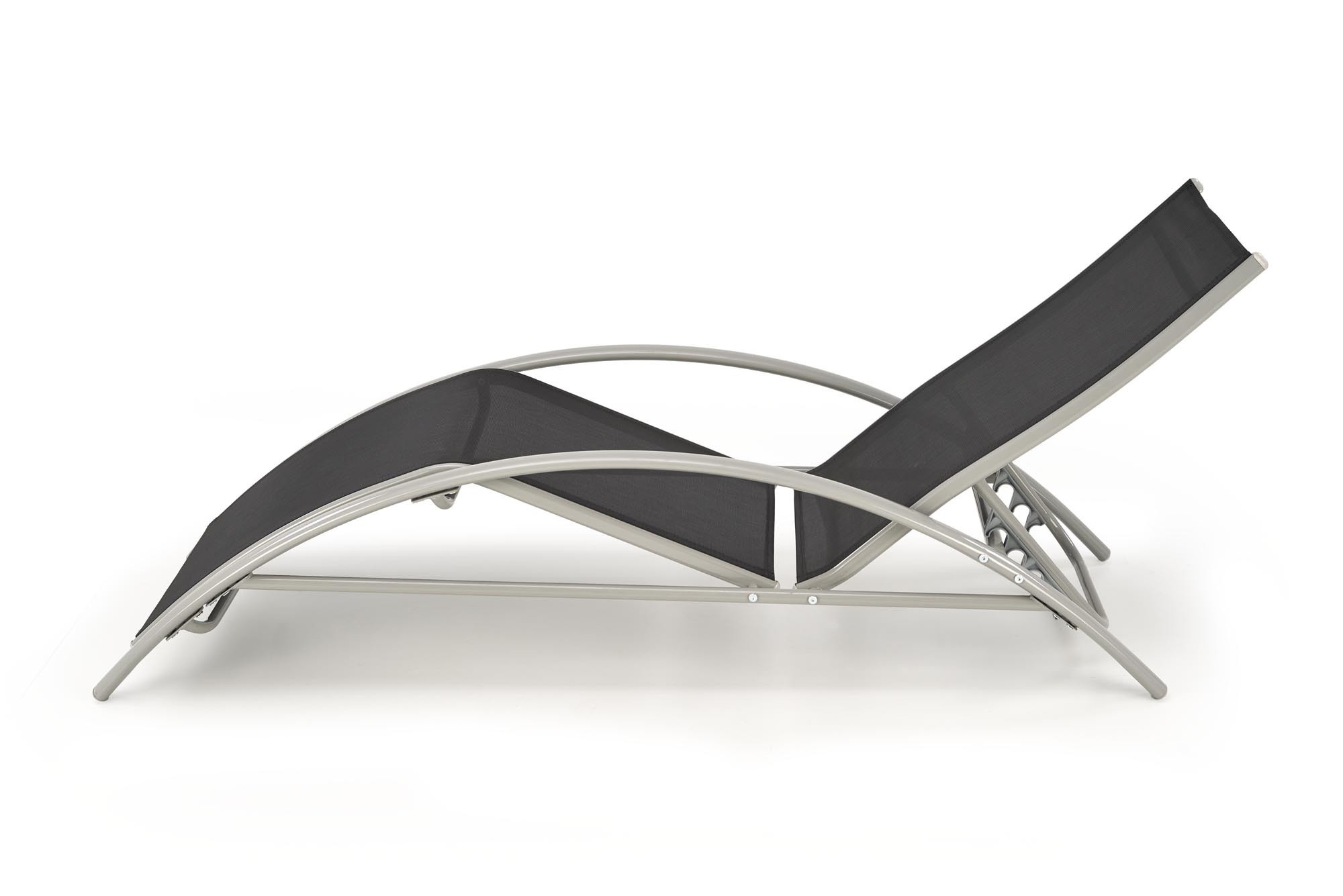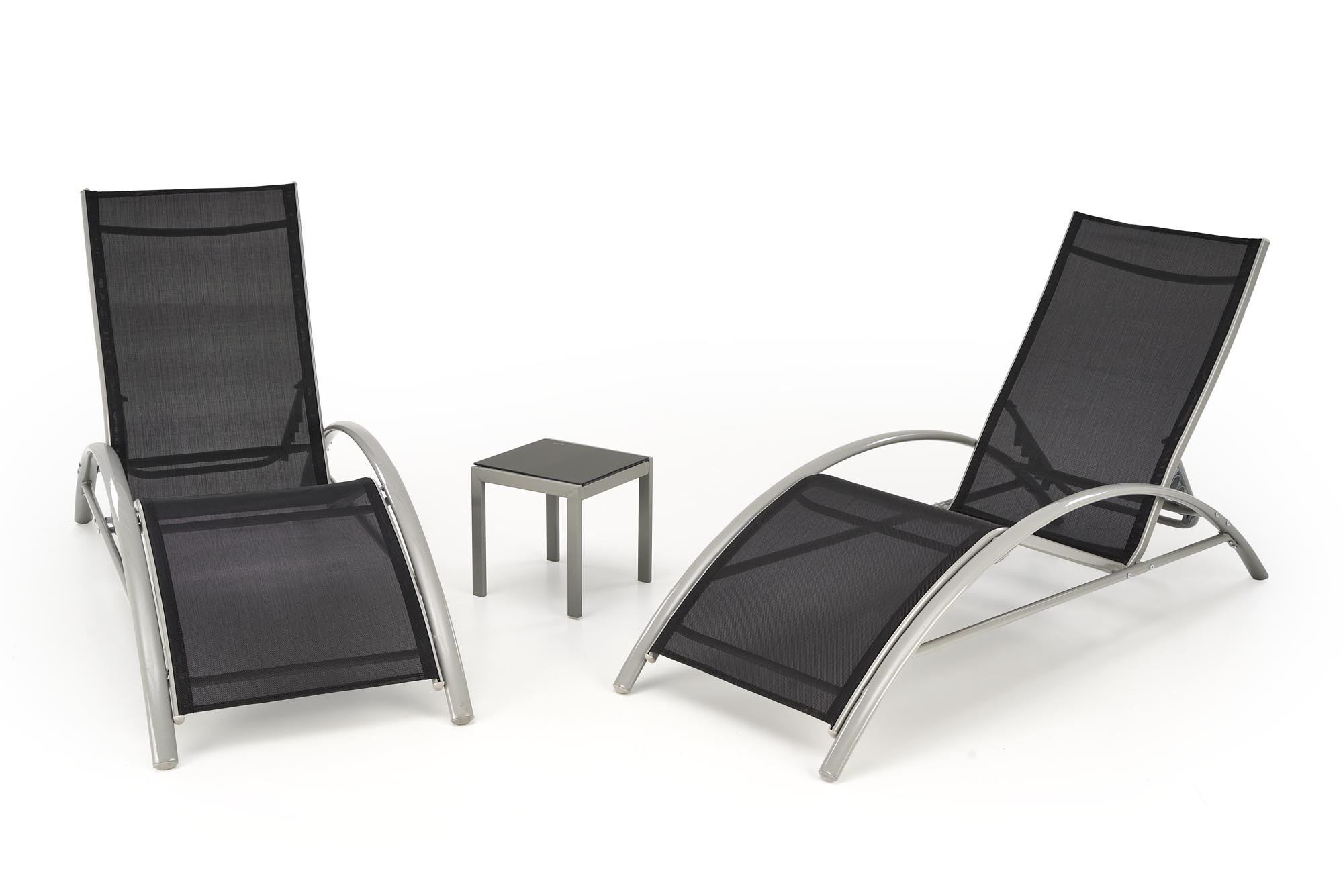 2 napozóágy szett asztallal, méretek: 160/60/66-92 cm - napozóágy, 30/30/30 cm - asztal, anyag: háló / porszórt acél, szín: fekete / világosszürke