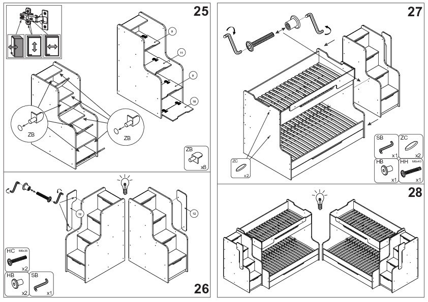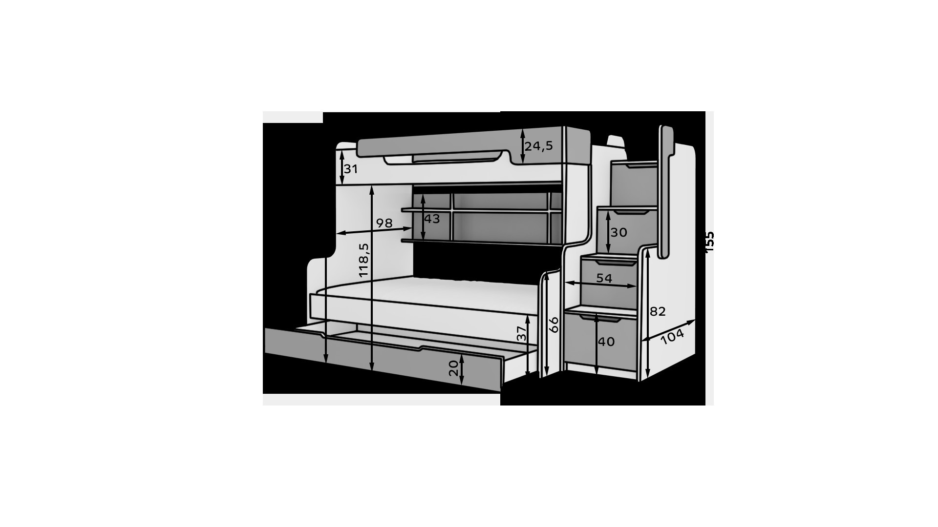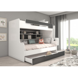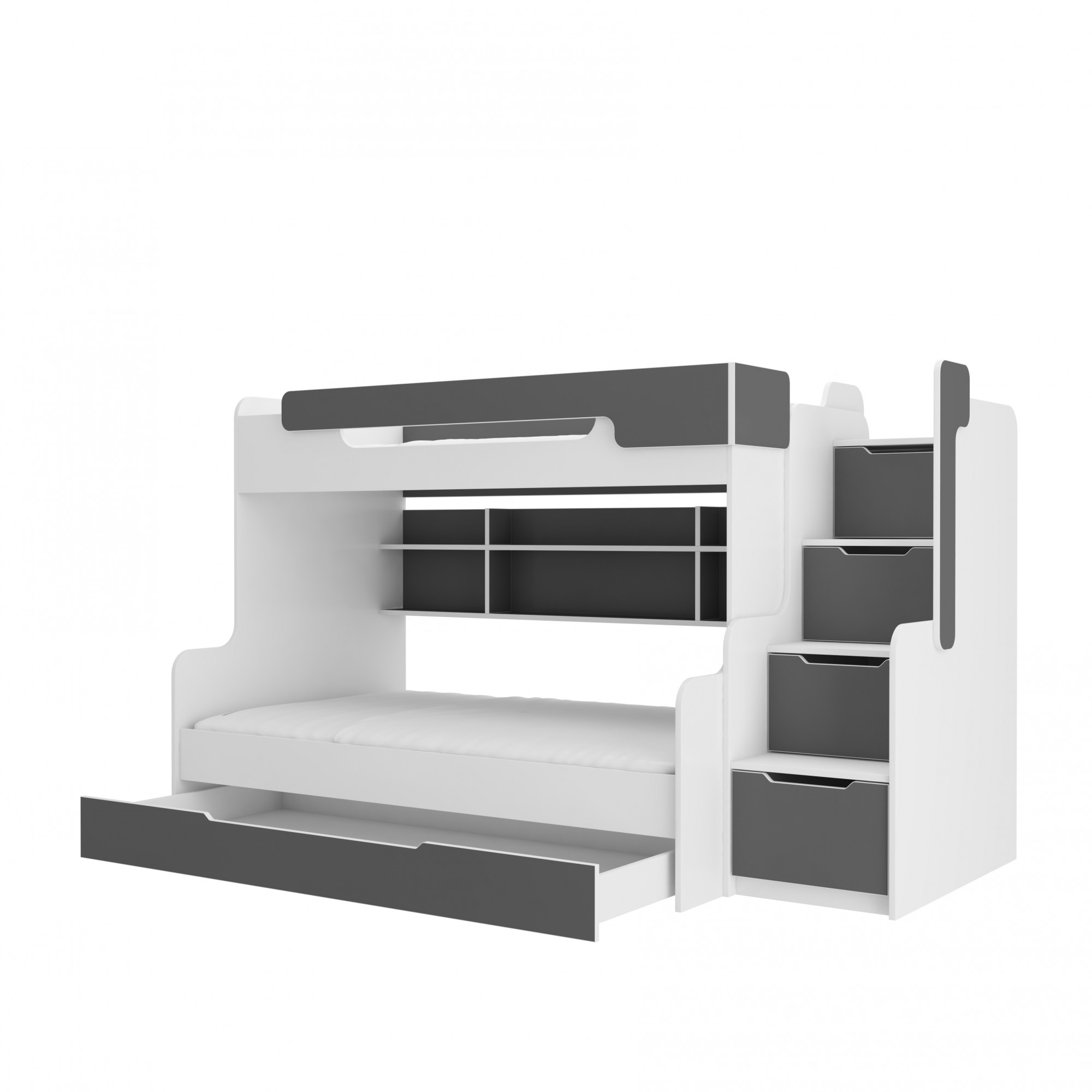 A HARELL háromszintes emeletes ágy remek ötlet a helytakarékosságra egy kis gyerekszobában. Az ágy lépcsőkkel nemcsak alvóhelyet biztosít, hanem ideális megoldás a tárolóhely számára is. Minden lépcső alatt tárolóhely található, amely további helyet biztosít könyveknek vagy játékoknak. Az ággyal együtt kap egy matrackészletet: egy 200x90 cm-es habmatracot és egy 200x120 cm-es bonellrugós matracot.