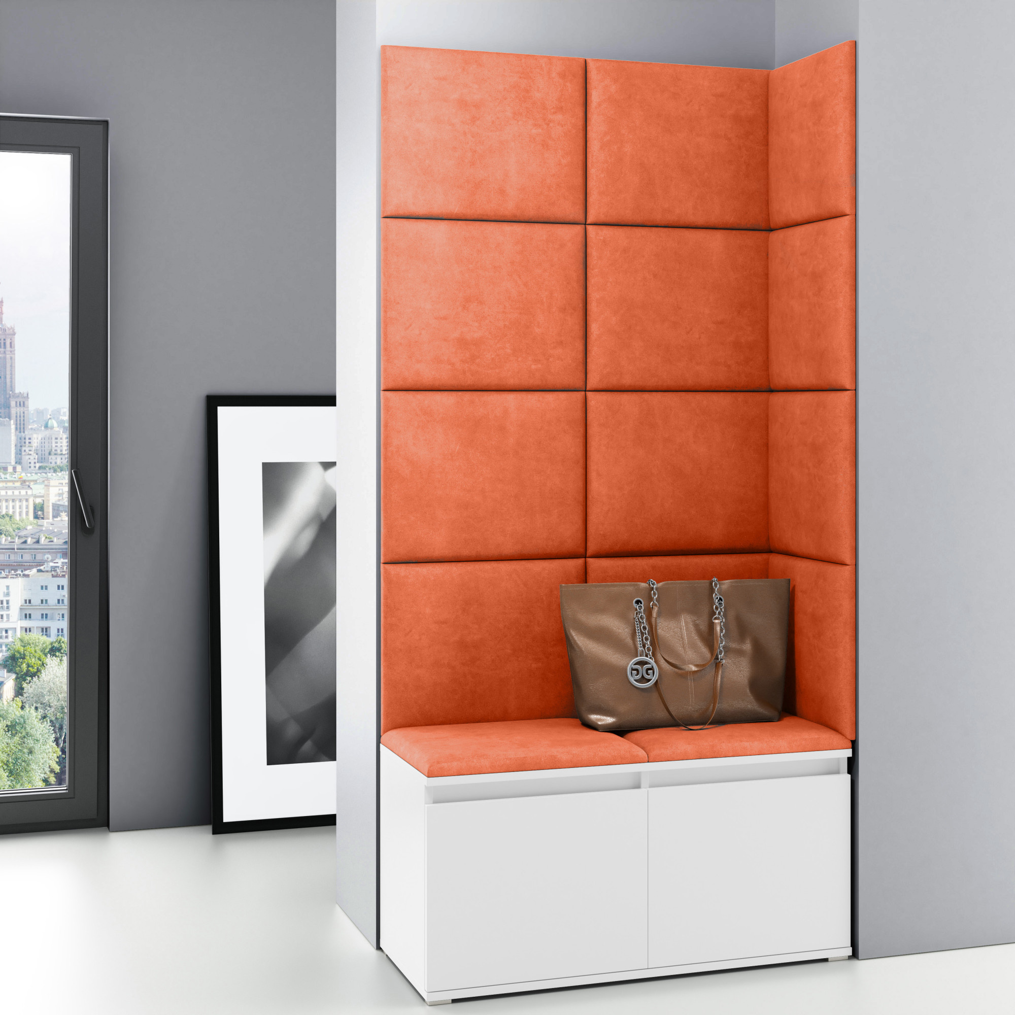 A paneleket kárpitszövettel vonták be. A paneleket a falhoz ragasztóval vagy kétoldalas tépőzárral rögzítik.