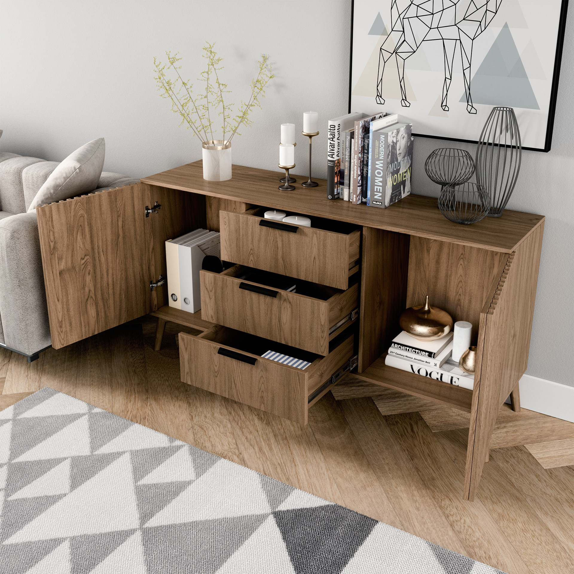 The Entsian sideboard is an excellent piece of furniture that combines functionality with elegance, creating a unique atmosphere in your interior. With a depth of 40 cm, width of 150 cm, and height of 72 cm, this spacious sideboard offers plenty of storage space for various items. Made of durable 16 mm thick board, the Entsian sideboard ensures a solid construction that will last for many years. The wooden legs, with a height of 12 cm, add stability and subtlety to the furniture, creating a harmonious look. The Entsian sideboard features three drawers, perfect for storing smaller items, and two pairs of doors that conceal additional space for larger items. Furthermore, the door fronts are beautifully finished with carved details, giving the furniture a unique character and aesthetic appeal. The drawers of the Entsian sideboard are equipped with ABS edges, providing durability and protection against damage. This allows you to enjoy a long-lasting and aesthetically pleasing solution. The Entsian sideboard is a perfect complement to various interior styles, from modern to classic. Its spacious interior and practical solutions facilitate organization and maintaining order in your home. Additionally, the carved fronts give the sideboard a distinctive look that attracts attention and adds elegance.