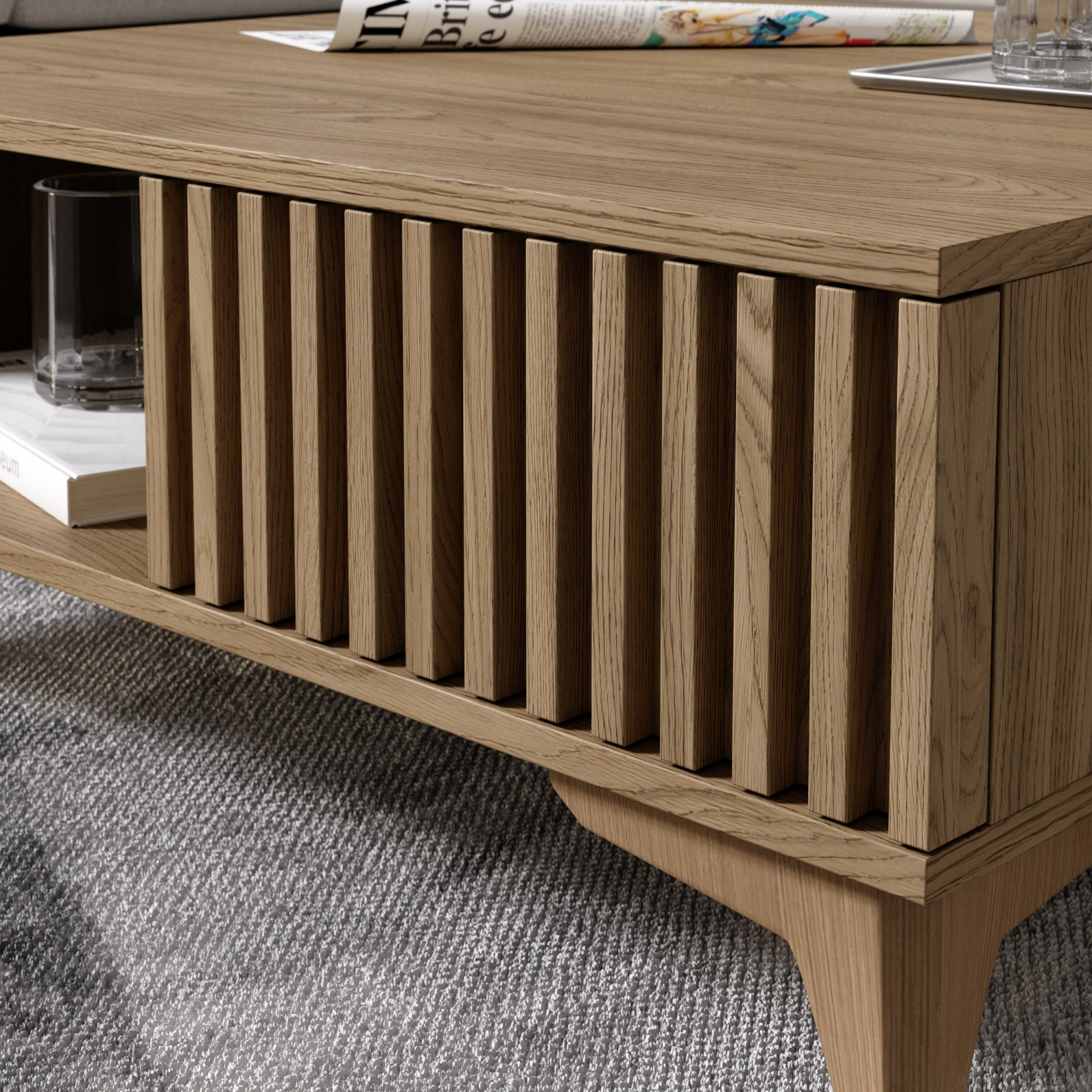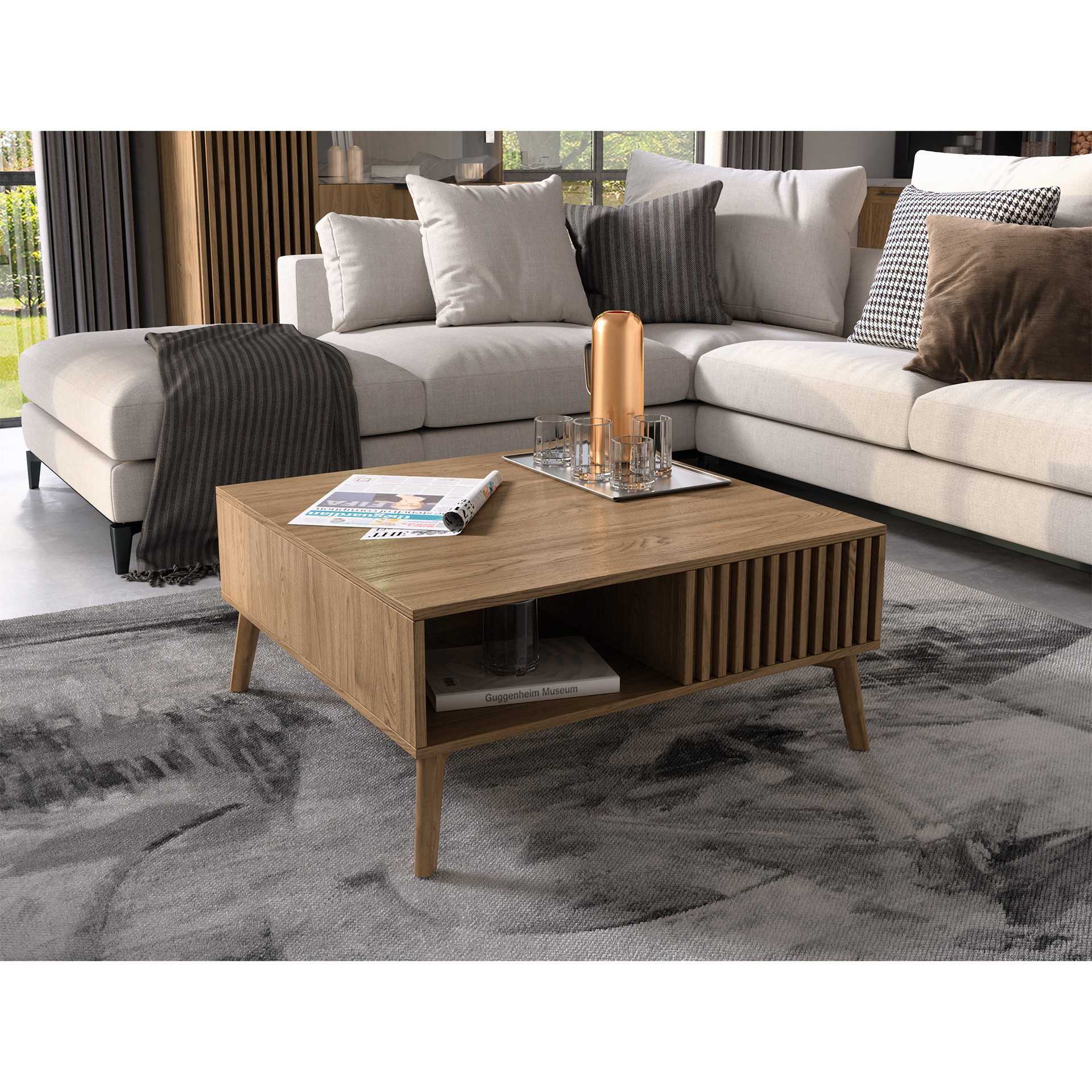The Entsian coffee table is an elegant and functional addition to your living room. Designed with practicality and aesthetics in mind, this table offers plenty of storage and display space for your favorite items. With a depth and width of 80 cm, this coffee table has perfect proportions to fit most spaces. Its low height of 32 cm gives it a modern look and makes it comfortable to use while enjoying drinks or watching TV. The Entsian coffee table features sturdy legs measuring 12 cm in height, made of durable wood. These legs provide stability and a solid foundation, adding elegance and style to your interior. Made from durable 16 mm thick board, the table guarantees durability and solidity. Its surface is meticulously finished, and the drawer edges are covered with a durable ABS material, adding a unique character and protection against damage. The Entsian coffee table has a practical drawer with milled fronts, allowing you to store small items and maintain a tidy living room. Additionally, it has an open shelf, perfect for showcasing decorations, books, or magazines.This coffee table is a combination of functionality, solidity, and stylish design. With its dimensions and practical features, it will seamlessly blend into any interior, adding a touch of uniqueness and elegance.