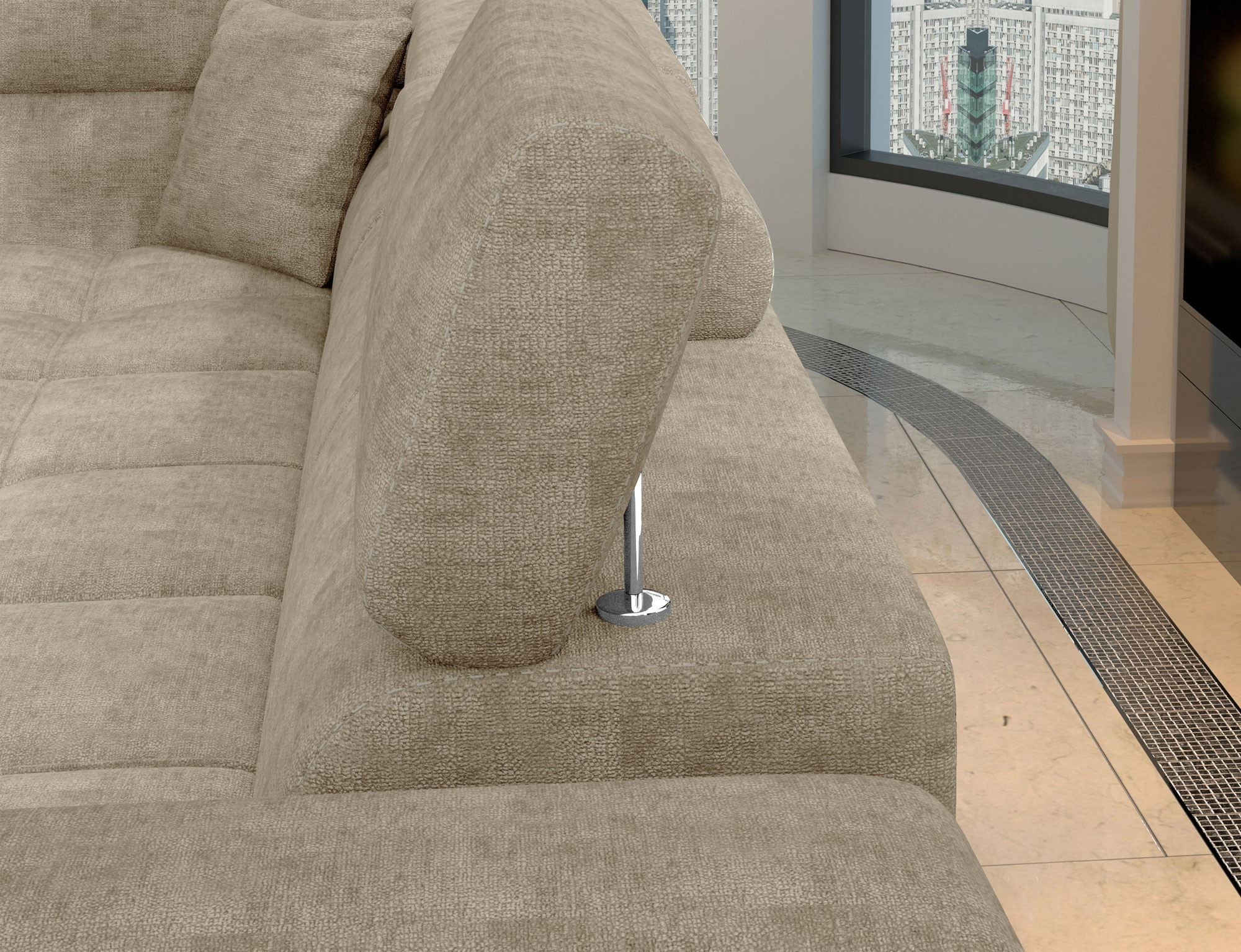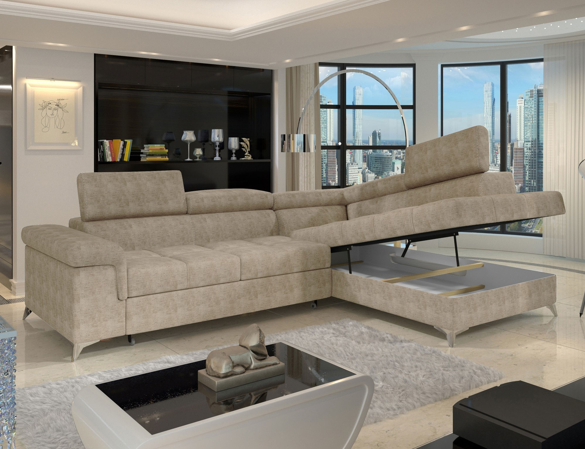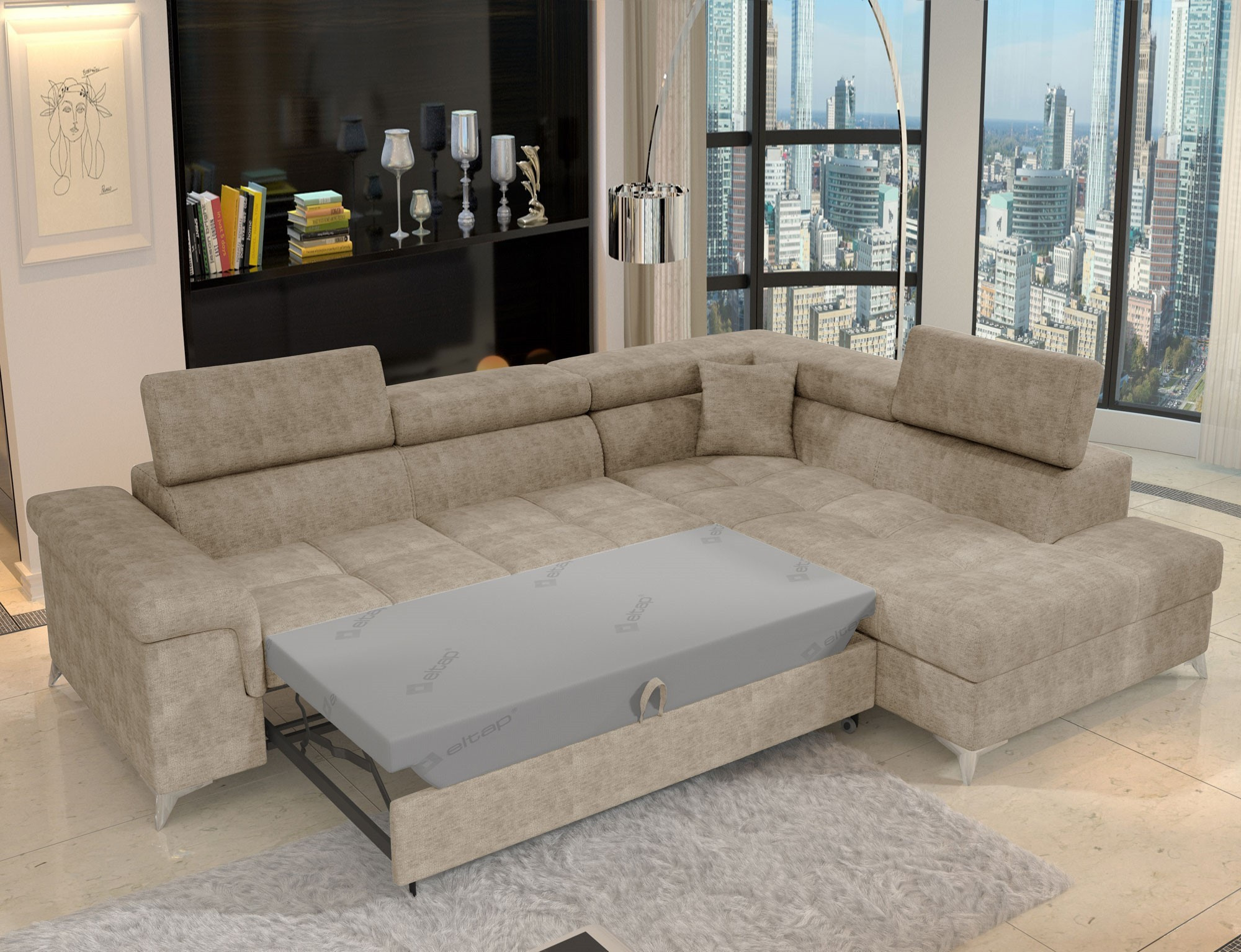 Eridano is a multifunctional, comfortable and elegant L-shaped corner unit that can be a luxurious finish to any living room. It is a high-quality piece of furniture, synonymous with comfort and class, thanks to a wide seat with a depth of 60 cm and solid filling - a wave spring with T3030 foam, as well as high-quality elastic HR foam gives the effect of exceptional elasticity while properly supporting the body during rest. Eridano, with dimensions of 275 x 202 x 88 cm, means not only comfort, but also a good night's sleep thanks to an exceptionally large sleeping area. The dolphin-type unfolding mechanism allows for simple and intuitive unfolding of the sofa, which is transformed into a spacious bed measuring 125 x 205 cm. In addition, our corner sofa bed is also equipped with a practical and spacious storage for bedding located in an ottoman that opens upwards. The characteristic features of this model include: a wide armrest, an upholstered back, contoured backrest with movable headrests, metal, chrome legs with high gloss, as well as a multitude of variants in rich colours. Should you be interested in what else our Eridano has to offer - we invite you to test our corner unit.