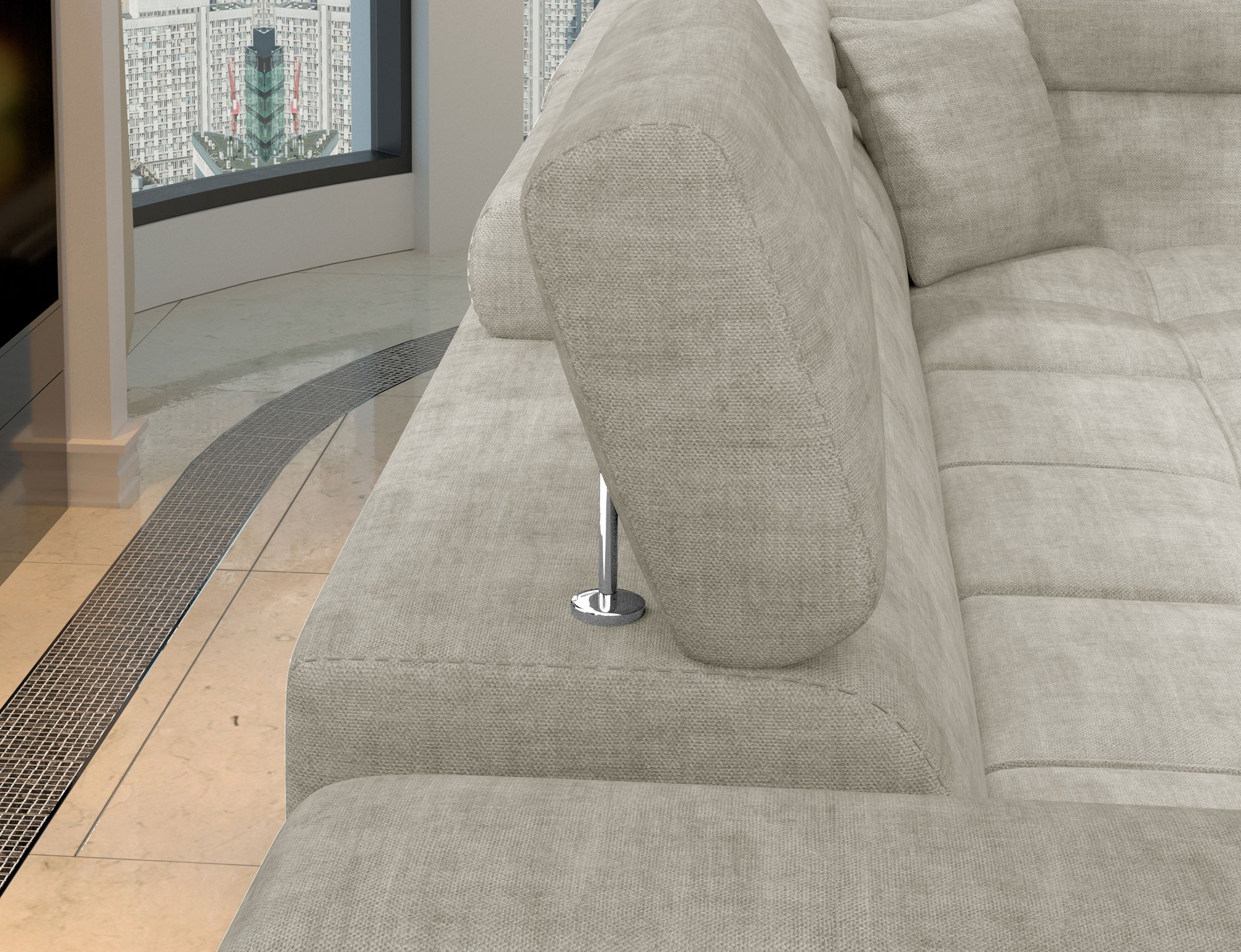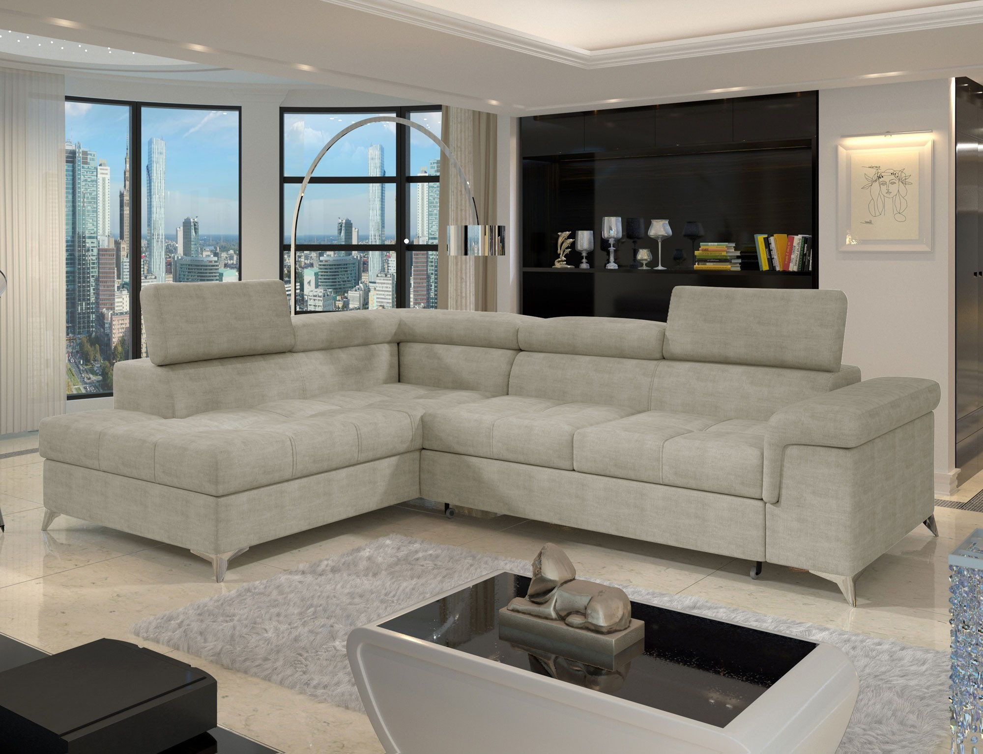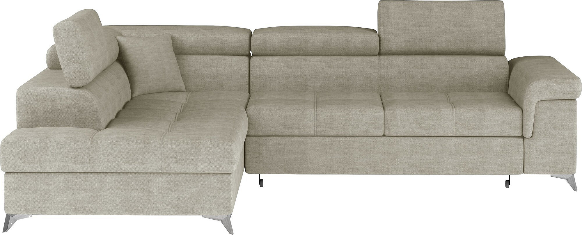 Eridano is a multifunctional, comfortable and elegant L-shaped corner unit that can be a luxurious finish to any living room. It is a high-quality piece of furniture, synonymous with comfort and class, thanks to a wide seat with a depth of 60 cm and solid filling - a wave spring with T3030 foam, as well as high-quality elastic HR foam gives the effect of exceptional elasticity while properly supporting the body during rest. Eridano, with dimensions of 275 x 202 x 88 cm, means not only comfort, but also a good night's sleep thanks to an exceptionally large sleeping area. The dolphin-type unfolding mechanism allows for simple and intuitive unfolding of the sofa, which is transformed into a spacious bed measuring 125 x 205 cm. In addition, our corner sofa bed is also equipped with a practical and spacious storage for bedding located in an ottoman that opens upwards. The characteristic features of this model include: a wide armrest, an upholstered back, contoured backrest with movable headrests, metal, chrome legs with high gloss, as well as a multitude of variants in rich colours. Should you be interested in what else our Eridano has to offer - we invite you to test our corner unit.