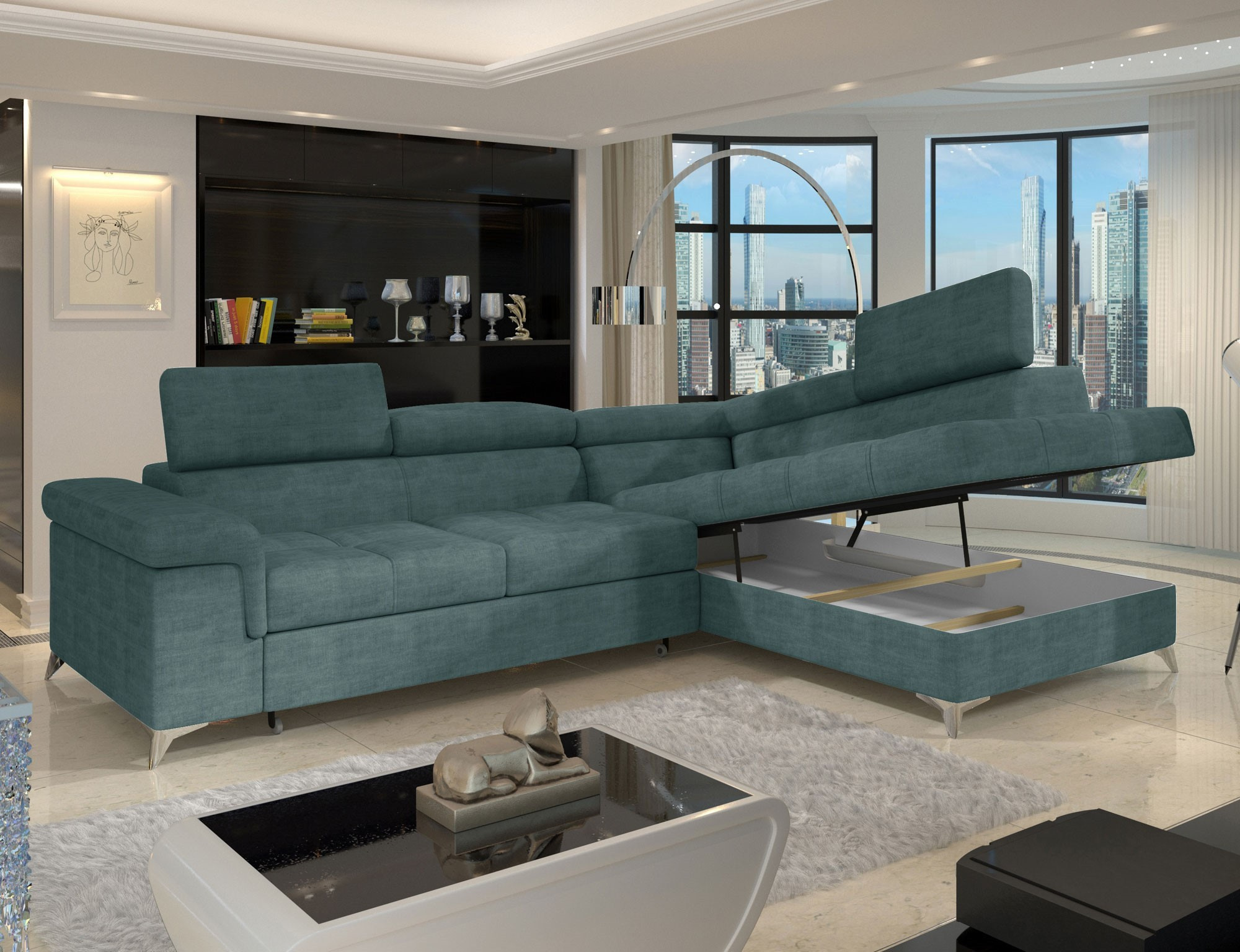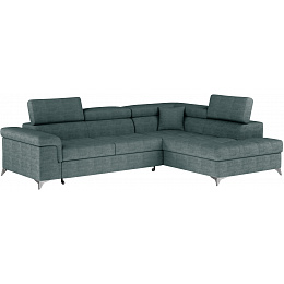 Eridano is a multifunctional, comfortable and elegant L-shaped corner unit that can be a luxurious finish to any living room. It is a high-quality piece of furniture, synonymous with comfort and class, thanks to a wide seat with a depth of 60 cm and solid filling - a wave spring with T3030 foam, as well as high-quality elastic HR foam gives the effect of exceptional elasticity while properly supporting the body during rest. Eridano, with dimensions of 275 x 202 x 88 cm, means not only comfort, but also a good night's sleep thanks to an exceptionally large sleeping area. The dolphin-type unfolding mechanism allows for simple and intuitive unfolding of the sofa, which is transformed into a spacious bed measuring 125 x 205 cm. In addition, our corner sofa bed is also equipped with a practical and spacious storage for bedding located in an ottoman that opens upwards. The characteristic features of this model include: a wide armrest, an upholstered back, contoured backrest with movable headrests, metal, chrome legs with high gloss, as well as a multitude of variants in rich colours. Should you be interested in what else our Eridano has to offer - we invite you to test our corner unit.
