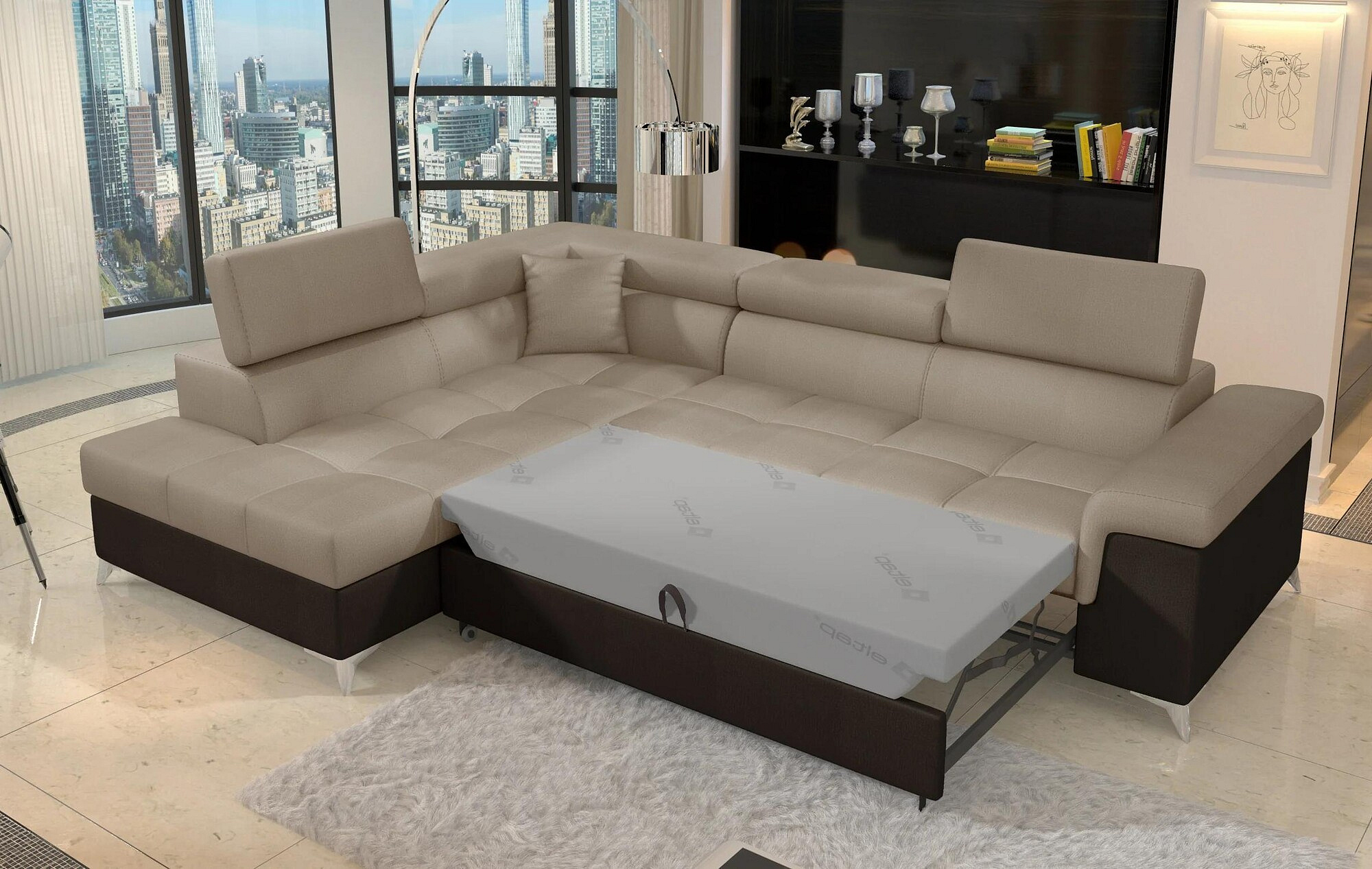 Eridano is a multifunctional, comfortable and elegant L-shaped corner sofa that can be a luxurious finishing touch to any living room. It is a high-quality piece of furniture, synonymous with comfort and class, thanks to its wide seat with a depth of 60 cm and solid filling - corrugated spring together with T30 foam, as well as high quality HR elastic foam gives the effect of exceptional resilience while properly supporting the body during rest. Behind the Eridano with dimensions of 275 x 202 x 90 cm, there is not only comfort, but also well-slept nights through an exceptionally large sleeping surface. The folding type of the dolphin mechanism allows you to simply and intuitively unfold the sofa, which transforms into a spacious bed of 125 x 193 cm. In addition, our corner sofa is also equipped with a practical and spacious bedding storage located in the upward-opening ottoman.Among the characteristics of this model we can include a wide armrest, upholstered back, contoured backrest with movable headrests, High-gloss metal chrome legs, as well as a multitude of variants in rich colors. If you are curious about what else our Eridano has to offer - we invite you to test our corner sofa.