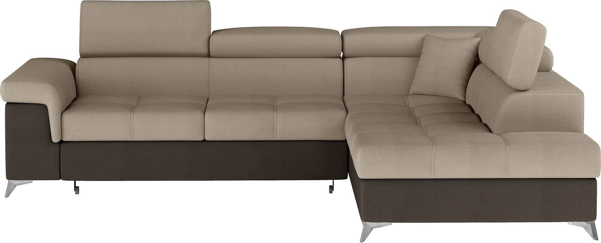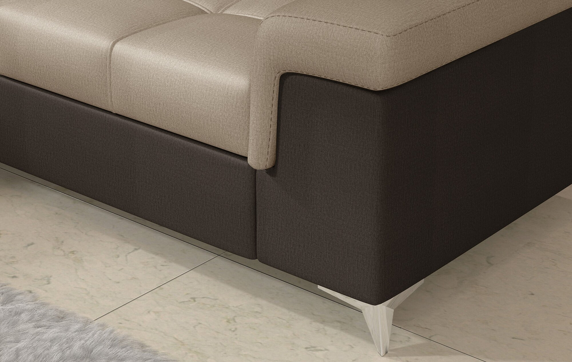 Eridano is a multifunctional, comfortable and elegant L-shaped corner sofa that can be a luxurious finishing touch to any living room. It is a high-quality piece of furniture, synonymous with comfort and class, thanks to its wide seat with a depth of 60 cm and solid filling - corrugated spring together with T30 foam, as well as high quality HR elastic foam gives the effect of exceptional resilience while properly supporting the body during rest. Behind the Eridano with dimensions of 275 x 202 x 90 cm, there is not only comfort, but also well-slept nights through an exceptionally large sleeping surface. The folding type of the dolphin mechanism allows you to simply and intuitively unfold the sofa, which transforms into a spacious bed of 125 x 193 cm. In addition, our corner sofa is also equipped with a practical and spacious bedding storage located in the upward-opening ottoman.Among the characteristics of this model we can include a wide armrest, upholstered back, contoured backrest with movable headrests, High-gloss metal chrome legs, as well as a multitude of variants in rich colors. If you are curious about what else our Eridano has to offer - we invite you to test our corner sofa.