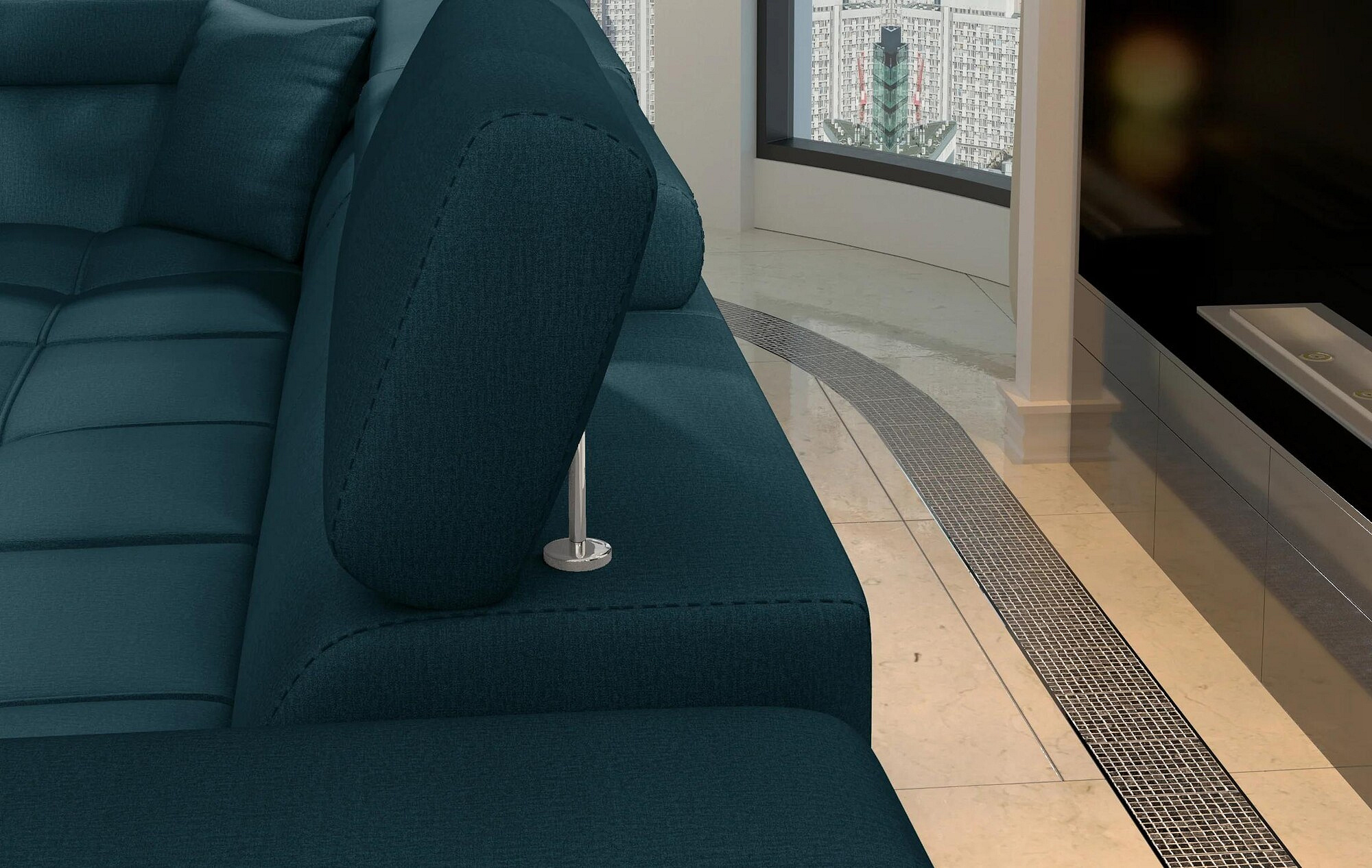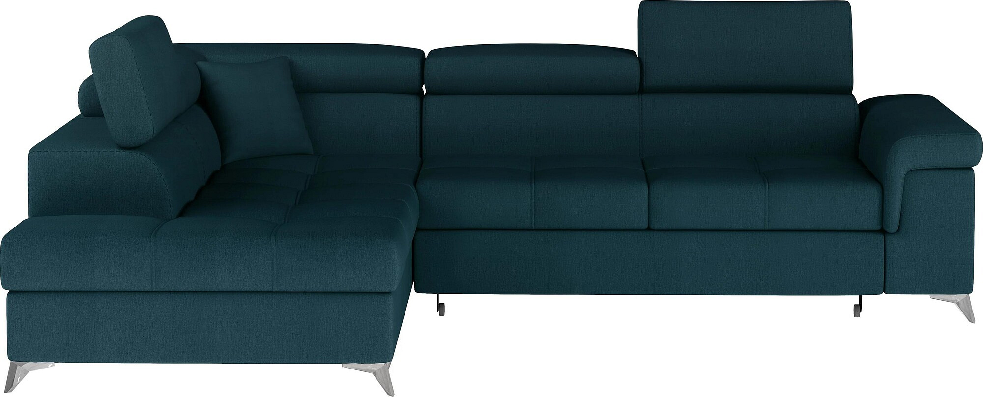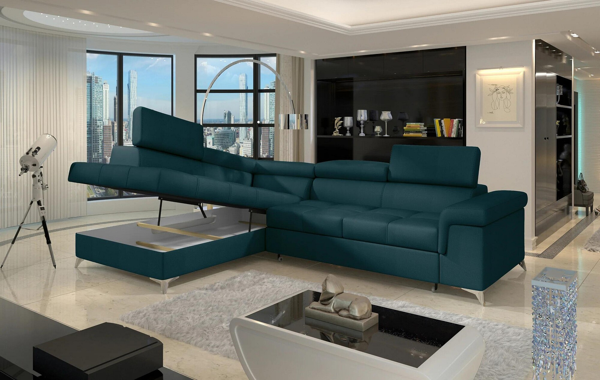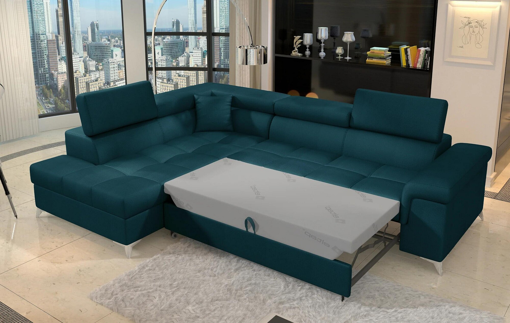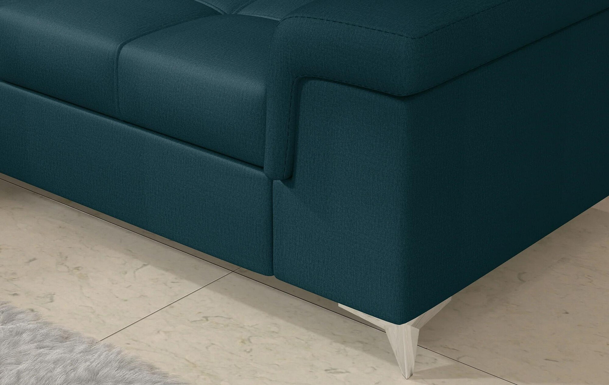 Eridano is a multifunctional, comfortable and elegant L-shaped corner sofa that can be a luxurious finishing touch to any living room. It is a high-quality piece of furniture, synonymous with comfort and class, thanks to its wide seat with a depth of 60 cm and solid filling - corrugated spring together with T30 foam, as well as high quality HR elastic foam gives the effect of exceptional resilience while properly supporting the body during rest. Behind the Eridano with dimensions of 275 x 202 x 90 cm, there is not only comfort, but also well-slept nights through an exceptionally large sleeping surface. The folding type of the dolphin mechanism allows you to simply and intuitively unfold the sofa, which transforms into a spacious bed of 125 x 193 cm. In addition, our corner sofa is also equipped with a practical and spacious bedding storage located in the upward-opening ottoman.Among the characteristics of this model we can include a wide armrest, upholstered back, contoured backrest with movable headrests, High-gloss metal chrome legs, as well as a multitude of variants in rich colors. If you are curious about what else our Eridano has to offer - we invite you to test our corner sofa.
