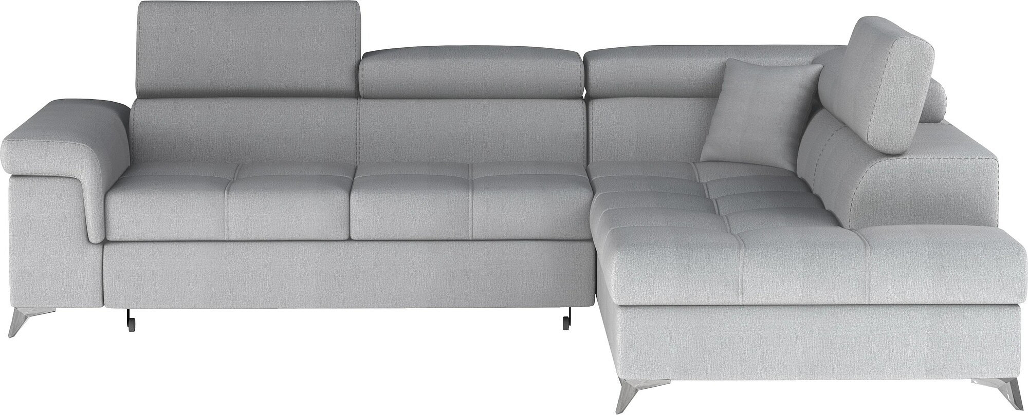 Eridano is a multifunctional, comfortable and elegant L-shaped corner sofa that can be a luxurious finishing touch to any living room. It is a high-quality piece of furniture, synonymous with comfort and class, thanks to its wide seat with a depth of 60 cm and solid filling - corrugated spring together with T30 foam, as well as high quality HR elastic foam gives the effect of exceptional resilience while properly supporting the body during rest. Behind the Eridano with dimensions of 275 x 202 x 90 cm, there is not only comfort, but also well-slept nights through an exceptionally large sleeping surface. The folding type of the dolphin mechanism allows you to simply and intuitively unfold the sofa, which transforms into a spacious bed of 125 x 193 cm. In addition, our corner sofa is also equipped with a practical and spacious bedding storage located in the upward-opening ottoman.Among the characteristics of this model we can include a wide armrest, upholstered back, contoured backrest with movable headrests, High-gloss metal chrome legs, as well as a multitude of variants in rich colors. If you are curious about what else our Eridano has to offer - we invite you to test our corner sofa.