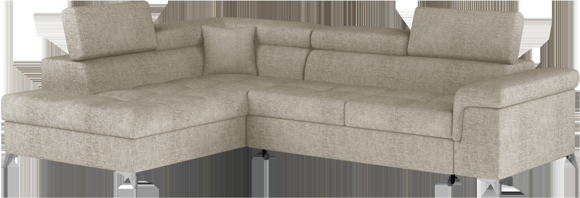 Eridano is a multifunctional, comfortable and elegant L-shaped corner unit that can be a luxurious finish to any living room. It is a high-quality piece of furniture, synonymous with comfort and class, thanks to a wide seat with a depth of 60 cm and solid filling - a wave spring with T3030 foam, as well as high-quality elastic HR foam gives the effect of exceptional elasticity while properly supporting the body during rest. Eridano, with dimensions of 275 x 202 x 88 cm, means not only comfort, but also a good night's sleep thanks to an exceptionally large sleeping area. The dolphin-type unfolding mechanism allows for simple and intuitive unfolding of the sofa, which is transformed into a spacious bed measuring 125 x 205 cm. In addition, our corner sofa bed is also equipped with a practical and spacious storage for bedding located in an ottoman that opens upwards. The characteristic features of this model include: a wide armrest, an upholstered back, contoured backrest with movable headrests, metal, chrome legs with high gloss, as well as a multitude of variants in rich colours. Should you be interested in what else our Eridano has to offer - we invite you to test our corner unit.