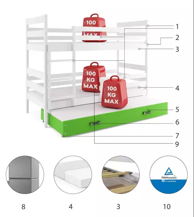 - Certyfikowane łóżko - jakość i bezpieczeństwo zgodnie z normami TUV.