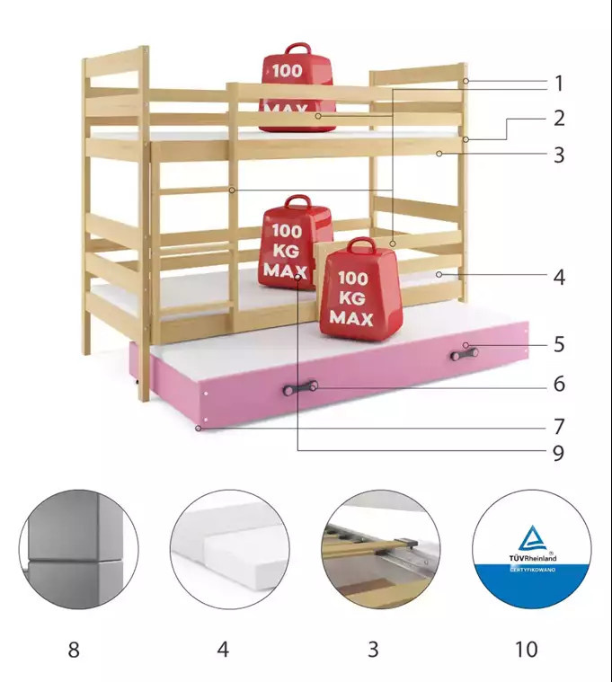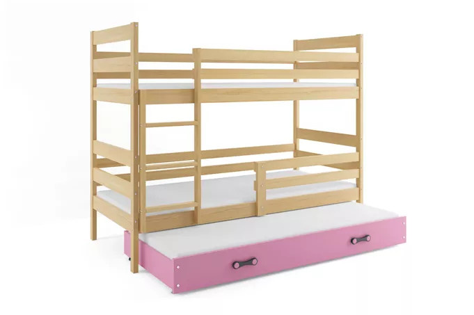 ERYK 3 OSOBOWE RAMA SOSNA SZUFLADA RÓŻOWY BEZ MATERACY 90 X 200 KPL