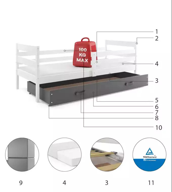 - Certyfikowane łóżko - jakość i bezpieczeństwo zgodnie z normami TUV.