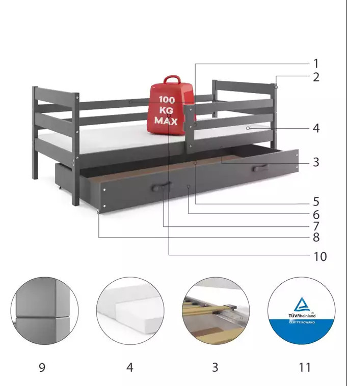 - Certyfikowane łóżko - jakość i bezpieczeństwo zgodnie z normami TUV.