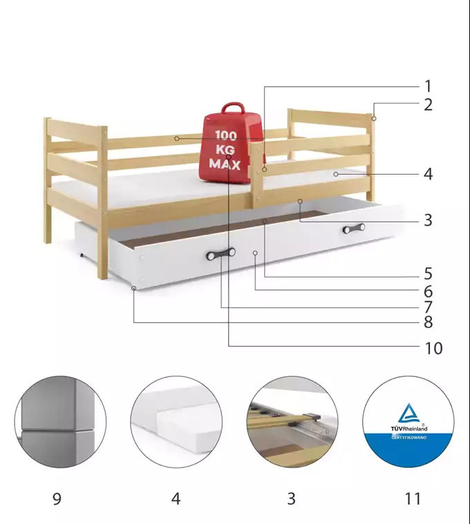 - Certyfikowane łóżko - jakość i bezpieczeństwo zgodnie z normami TUV.