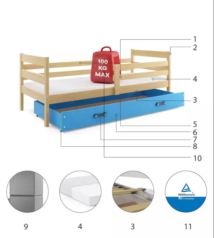 ERYK PARTEROWE RAMA SOSNA SZUFLADA NIEBIESKI BEZ MATERACY 90 X 200 KPL