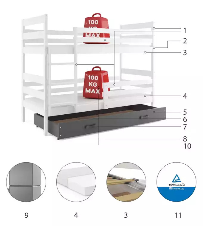 ERYK PIĘTROWE RAMA BIAŁY SZUFLADA GRAFIT 90 X 200 KPL