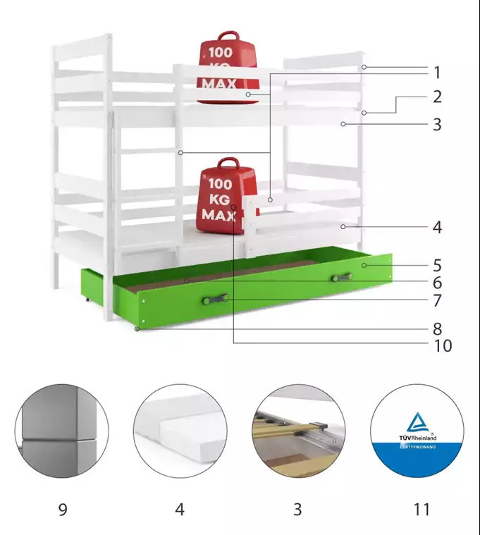 ERYK PIĘTROWE RAMA BIAŁY SZUFLADA ZIELONY 90 X 200 KPL