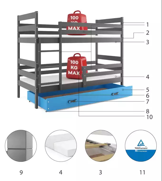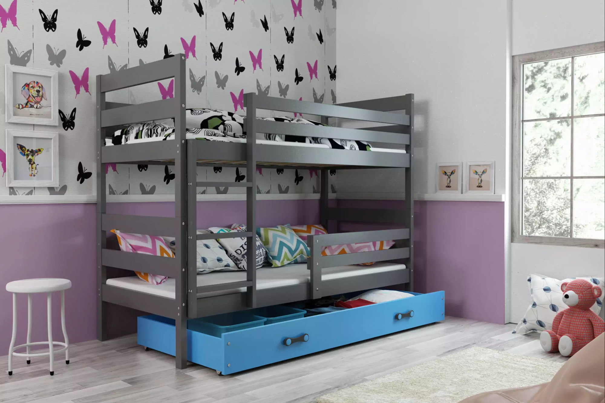 ERYK PIĘTROWE RAMA GRAFIT SZUFLADA NIEBIESKI BEZ MATERACY 90 X 200 KPL