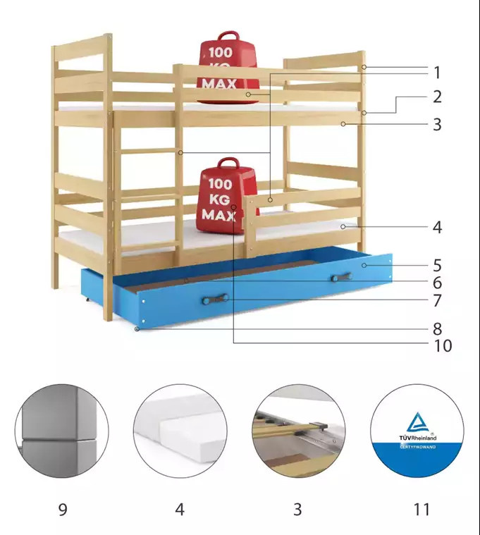 ERYK PIĘTROWE RAMA SOSNA SZUFLADA NIEBIESKI BEZ MATERACY 90 X 200 KPL
