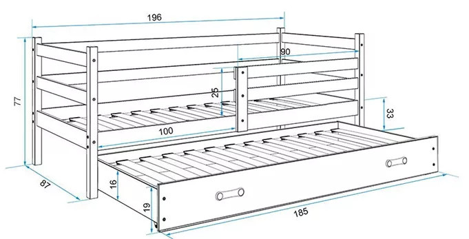- Szuflada - wykonana z płyty wiórowej, posiada funkcję dodatkowego spania.