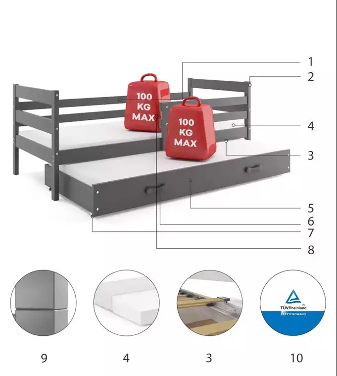 - Certyfikowane łóżko - jakość i bezpieczeństwo zgodnie z normami TUV.
