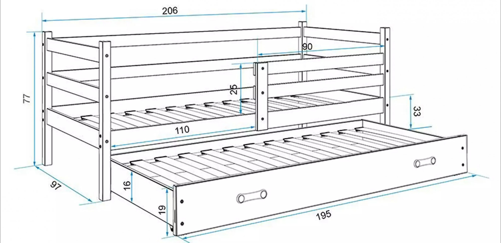 - Szuflada - wykonana z płyty wiórowej, posiada funkcję dodatkowego spania.