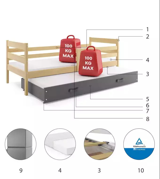 - Certyfikowane łóżko - jakość i bezpieczeństwo zgodnie z normami TUV.