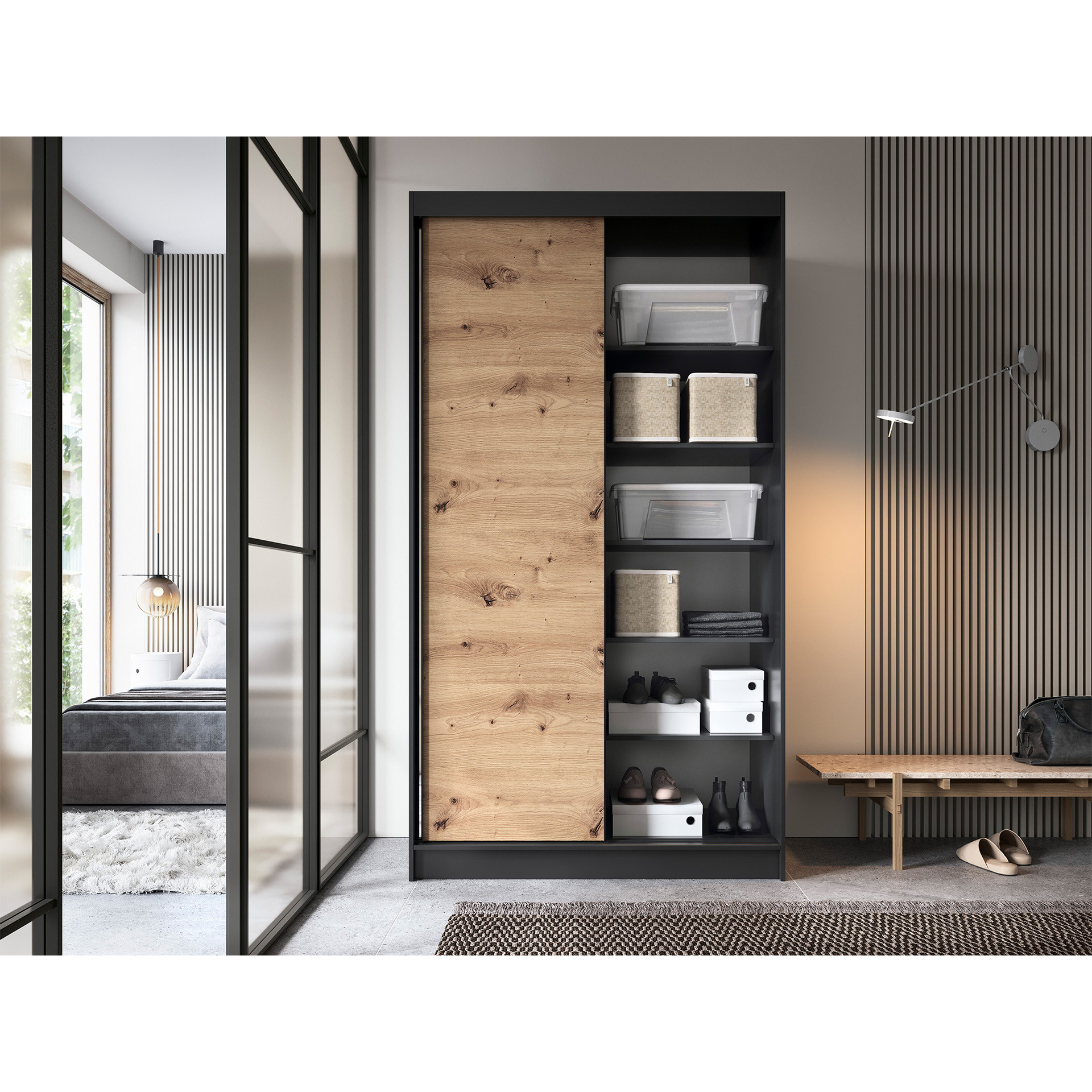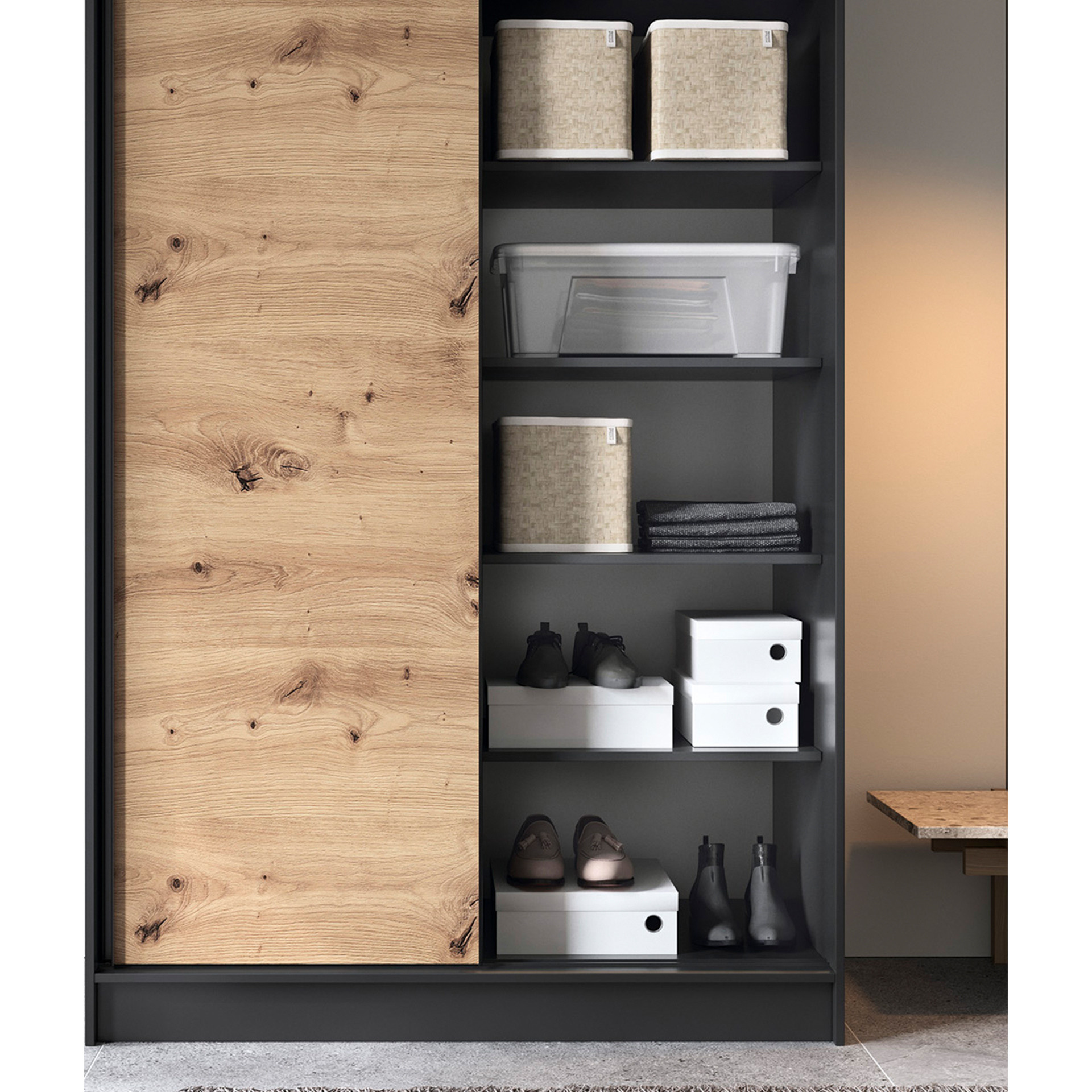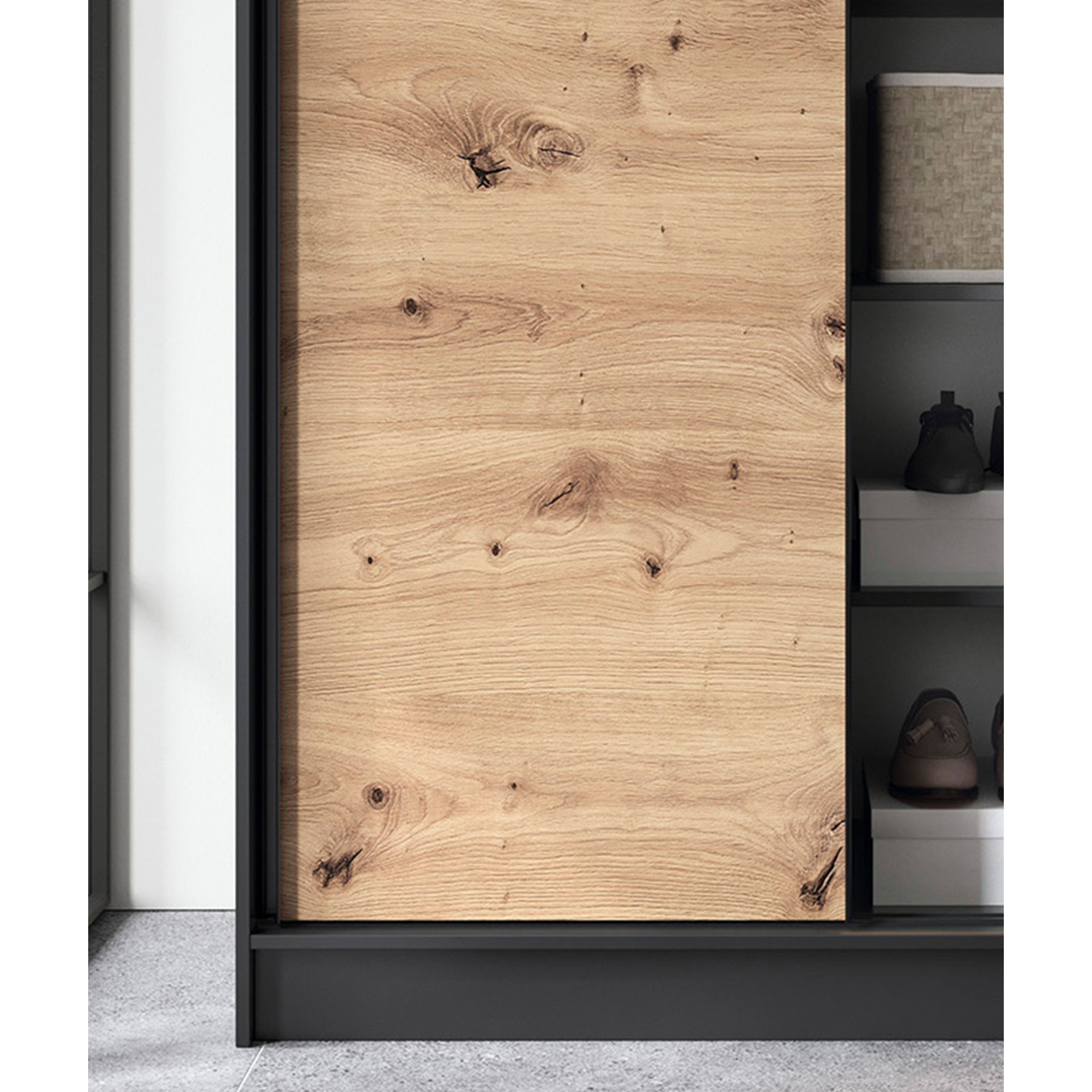 The Esville sliding door wardrobe is an excellent solution for organizing space in your room. It offers a practical and aesthetic approach to storage without the need for additional space for opening doors. With dimensions of 60 cm depth, 120 cm width, and 220 cm height, it fits perfectly into various interiors. The wardrobe has been made from high-quality materials, ensuring its durability and reliability. The wardrobe's body is made of a 16mm thick MDF board, providing stability and resilience. The ABS edge on the edges protects the wardrobe from damage and gives it an elegant look. The interior of the wardrobe has been intelligently designed to allow optimal use of space. The wardrobe includes 6 shelves, each capable of carrying a load of up to 10 kg, providing space for various items. The included rods allow for hanging clothes, ensuring order and easy access. The sliding doors, of which there are two, allow for convenient opening and closing of the wardrobe without taking up additional space in the room. This allows you to freely place the wardrobe even in a small room. The 0.5 cm high legs of the wardrobe are made of durable plastic, making it easier to move the furniture and keeping it at the right height to ensure stability. The color scheme of the wardrobe in shades of artisan oak and matte black gives it a modern and elegant character that blends well with various interior styles. In summary, the Esville sliding door wardrobe is a practical and aesthetic storage solution that enables you to organize space in your room without the need for traditional doors to open. Its solid construction, functionality, and modern design make it not only a practical piece of furniture but also an enhancement to your space.