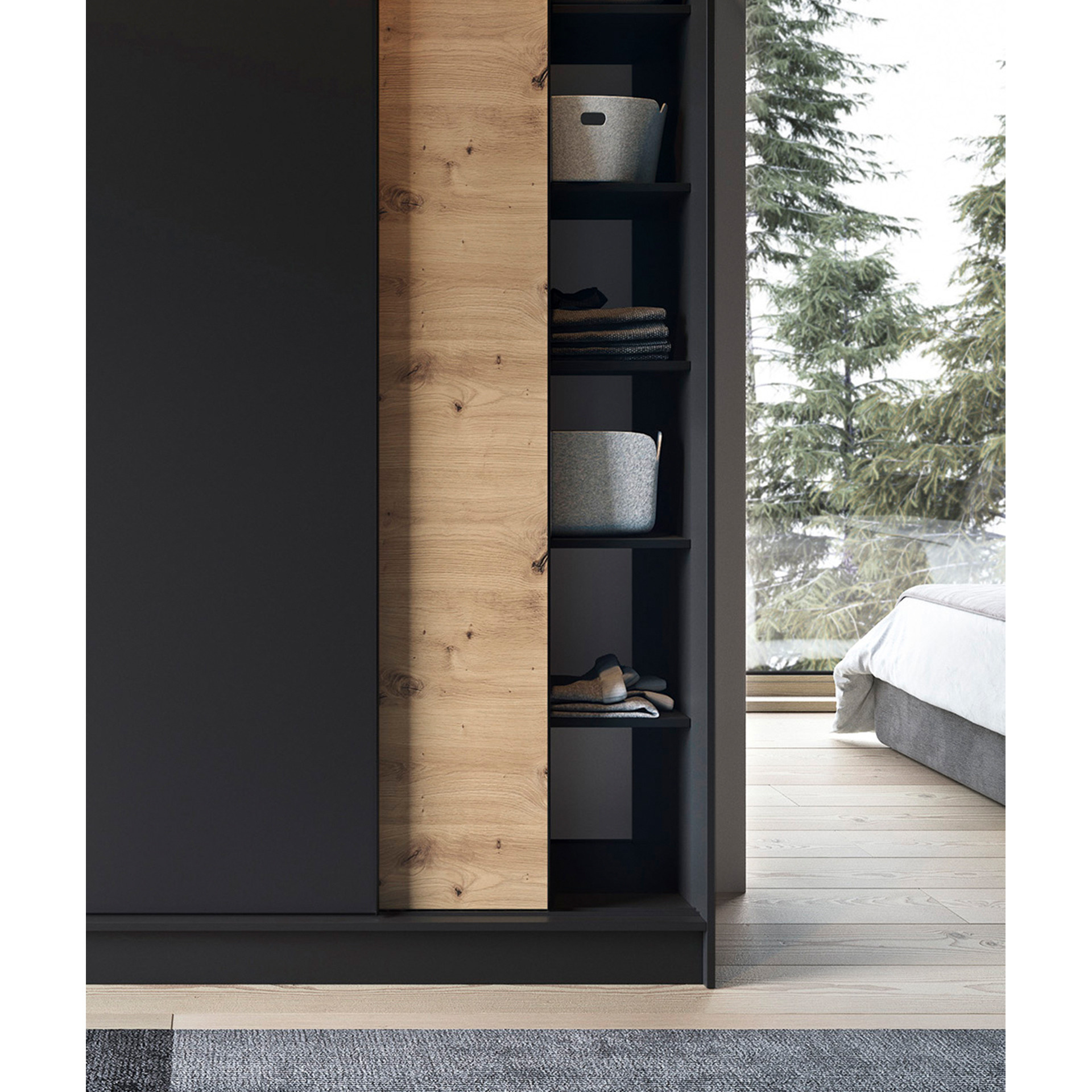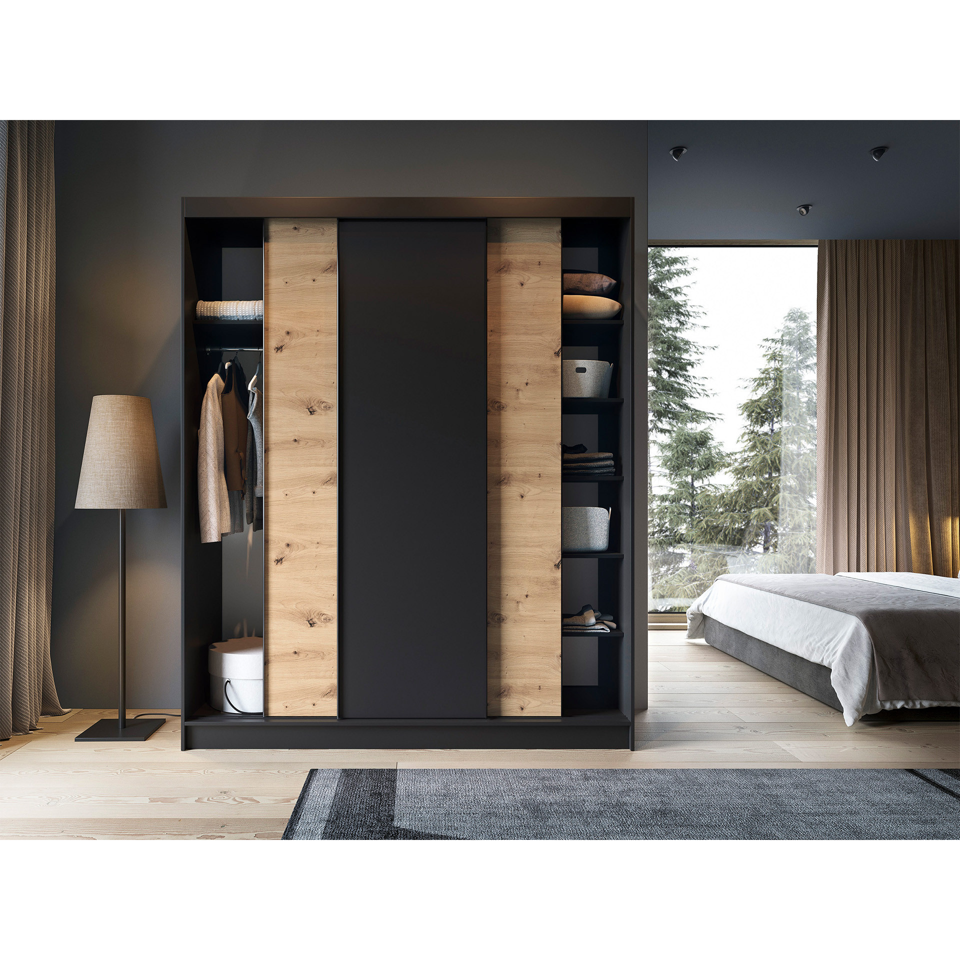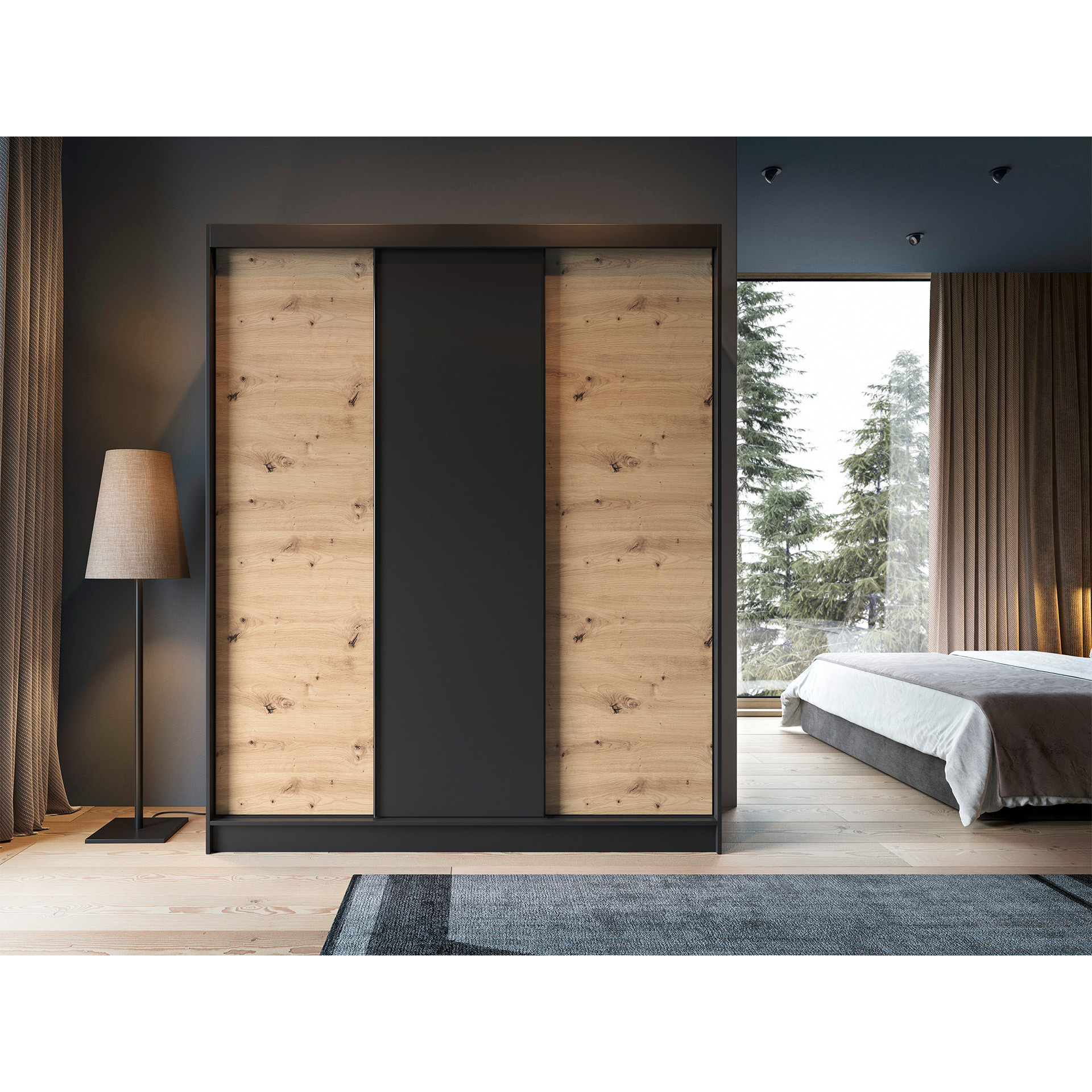 The Esville sliding door wardrobe, measuring 60 cm in depth, 180 cm in width, and 220 cm in height, available in artisan oak/matte black color, is a practical and elegant storage solution. Its solid construction and meticulous craftsmanship make it an ideal addition to your interior. The wardrobe is designed with optimal space utilization in mind. Its interior features 6 shelves, each capable of bearing a load of up to 10 kg, allowing for orderly storage of various items. Additionally, included rods enable clothing to be hung, further facilitating organization. Crafted from 16 mm thick MDF board, the wardrobe presents a solid structure, with ABS edges protecting it from damage and adding elegance to the overall composition. The 0.5 cm high legs, made of durable synthetic material with a black finish, provide stable placement and easy maneuverability. The Esville wardrobe offers three sliding doors, allowing for convenient opening and closing without occupying extra room space. This design makes it an ideal choice for smaller spaces as well. The color scheme of the wardrobe in artisan oak and matte black tones gives it a modern appearance that harmonizes well with various interior styles. Additionally, there is an option to choose between a version with a mirror and one without, allowing customization to your preferences. In summary, the Esville sliding door wardrobe in dimensions of 60 cm depth, 180 cm width, and 220 cm height is a functional and stylish furnishing element that will provide you with practical storage while adding elegance and aesthetics to your interior.