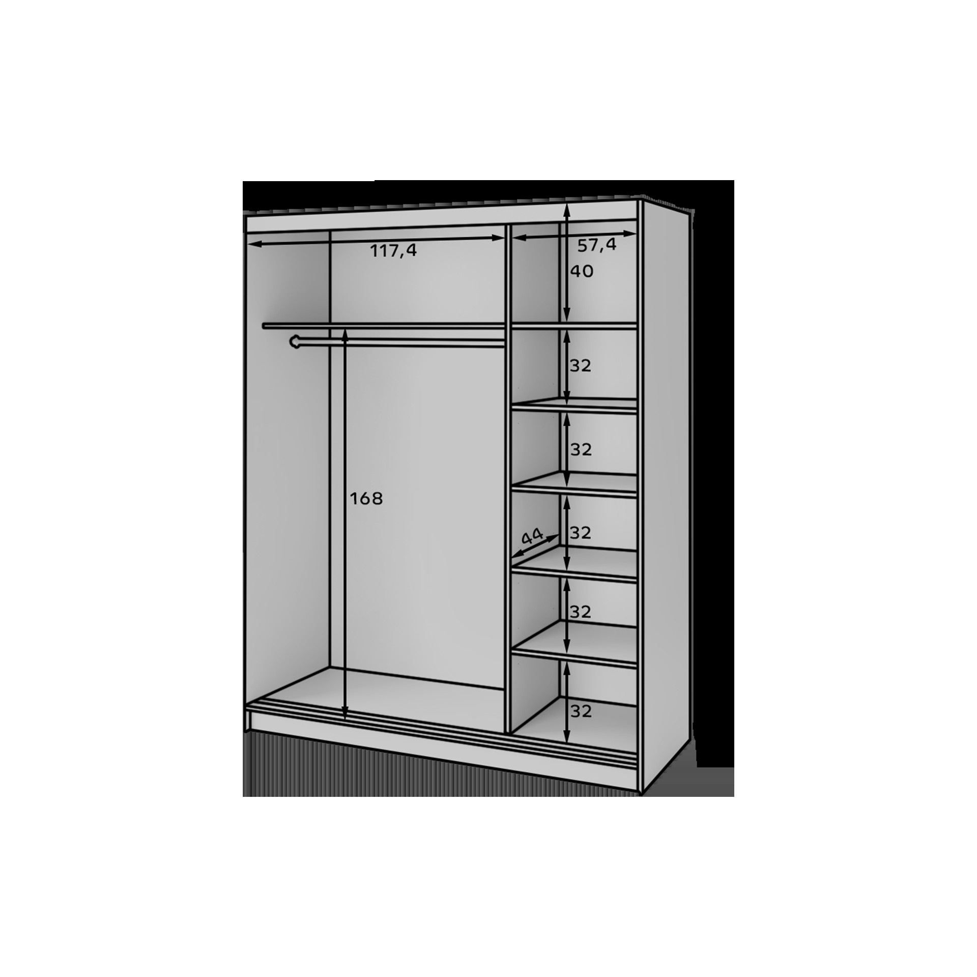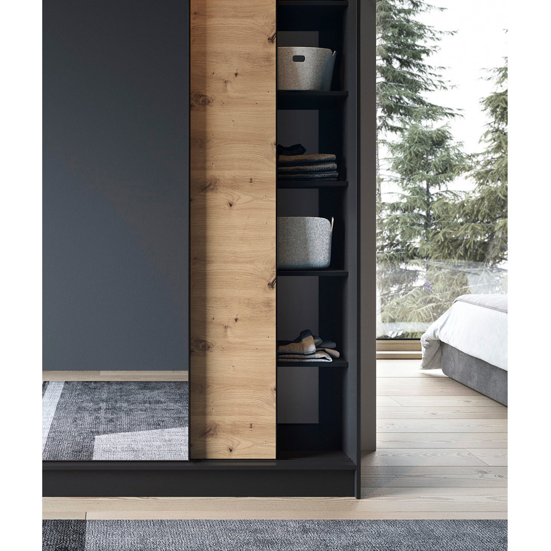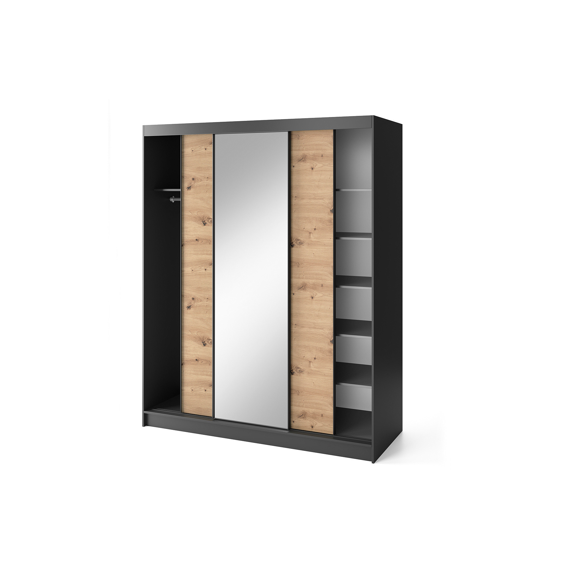 The Esville sliding door wardrobe with mirror, measuring 60 cm in depth, 180 cm in width, and 220 cm in height, available in artisan oak/matte black color, is a practical and elegant storage solution. Its solid construction and meticulous craftsmanship make it an ideal addition to your interior. The wardrobe is designed with optimal space utilization in mind. Its interior features 6 shelves, each capable of bearing a load of up to 10 kg, allowing for orderly storage of various items. Additionally, included rods enable clothing to be hung, further facilitating organization. Crafted from 16 mm thick MDF board, the wardrobe presents a solid structure, with ABS edges protecting it from damage and adding elegance to the overall composition. The 0.5 cm high legs, made of durable synthetic material with a black finish, provide stable placement and easy maneuverability. The Esville wardrobe with mirror offers three sliding doors, allowing for convenient opening and closing without occupying extra room space. This design makes it an ideal choice for smaller spaces as well. The color scheme of the wardrobe in artisan oak and matte black tones gives it a modern appearance that harmonizes well with various interior styles. In summary, the Esville sliding door wardrobe with mirror, in dimensions of 60 cm depth, 180 cm width, and 220 cm height, is a functional and stylish furnishing element that will provide you with practical storage while adding elegance, optical lightness, and aesthetics to your interior.
