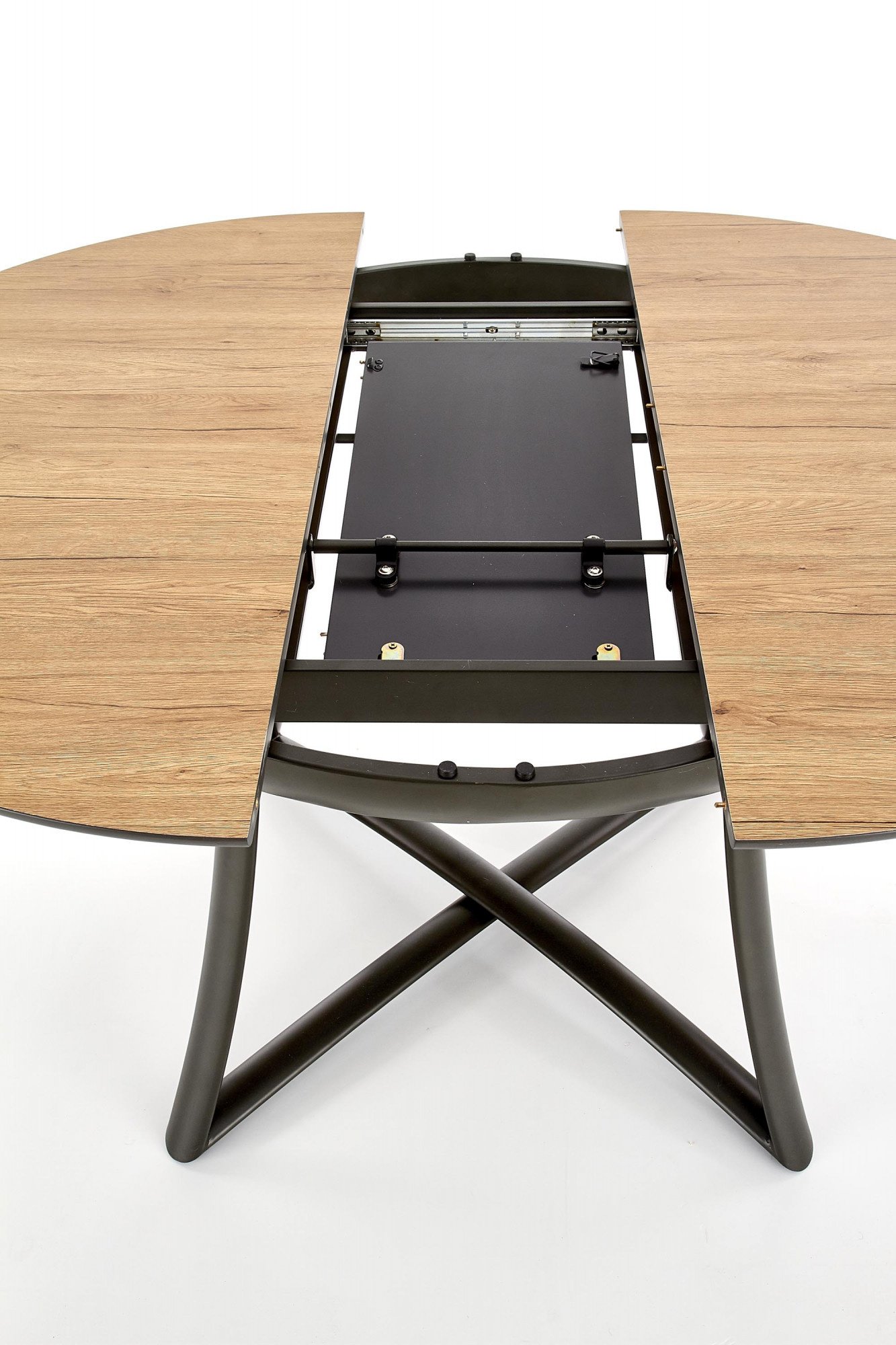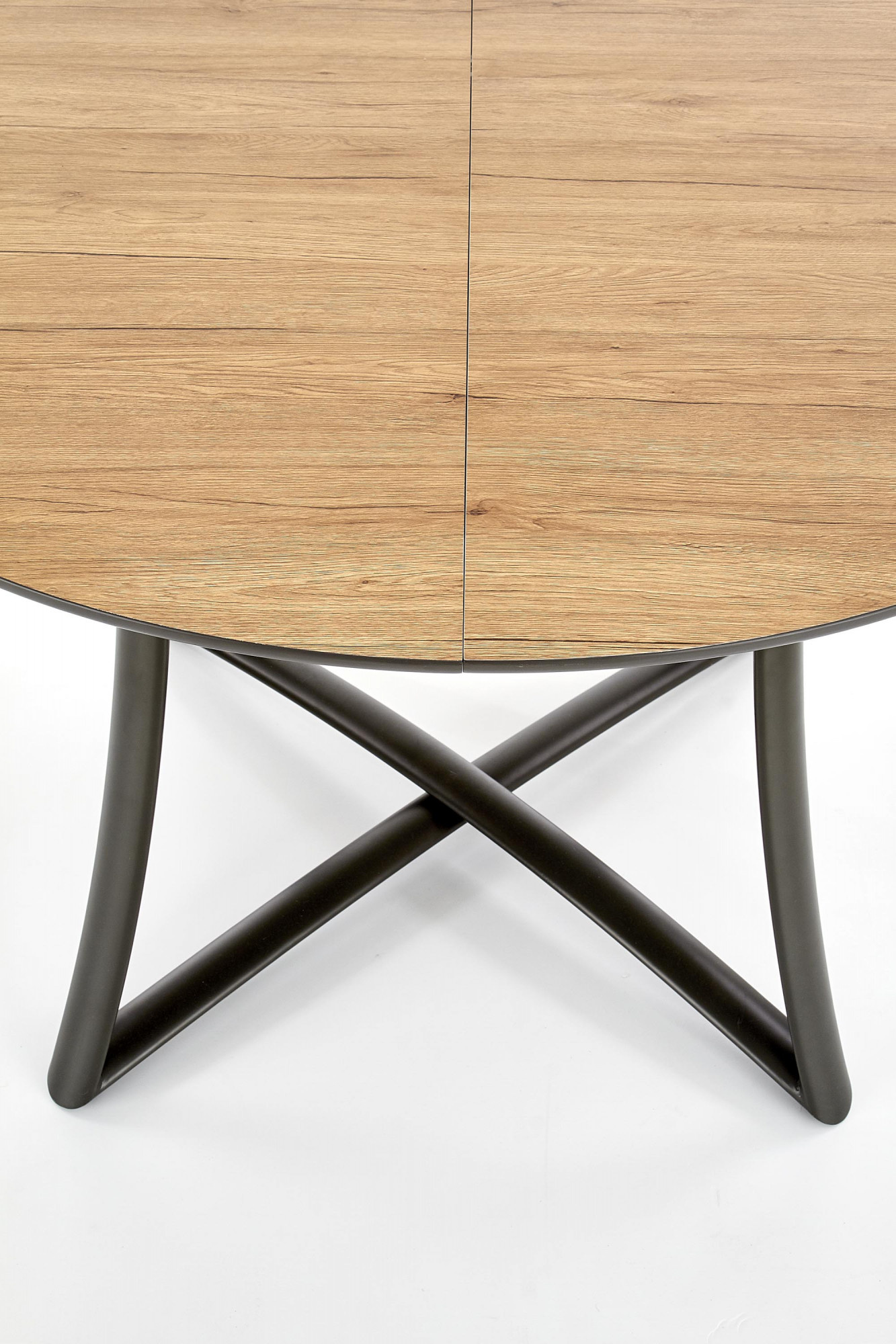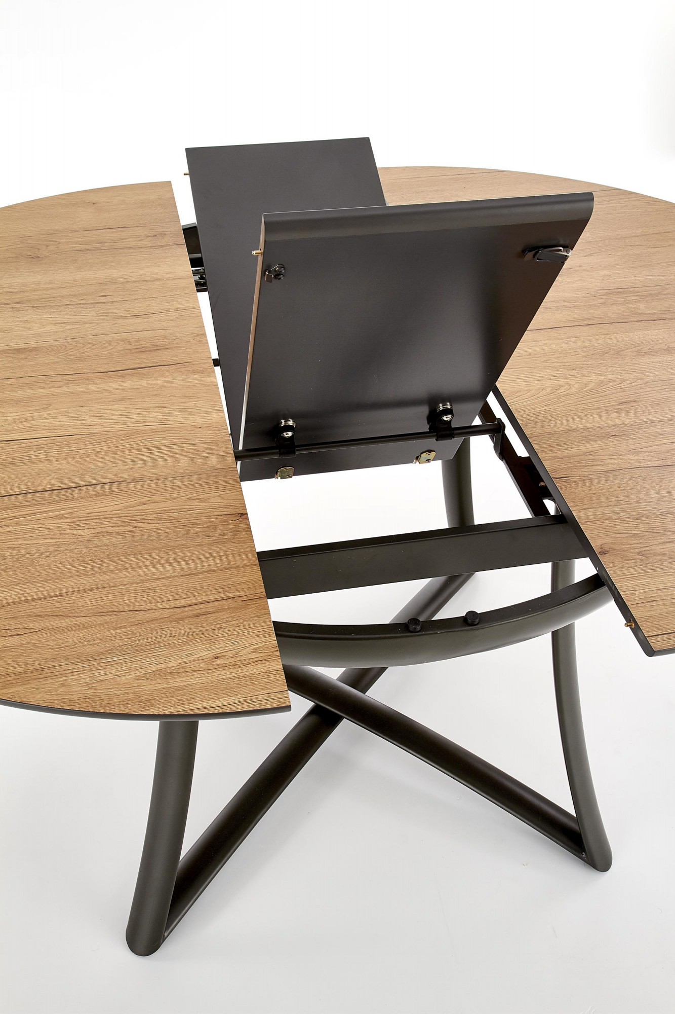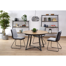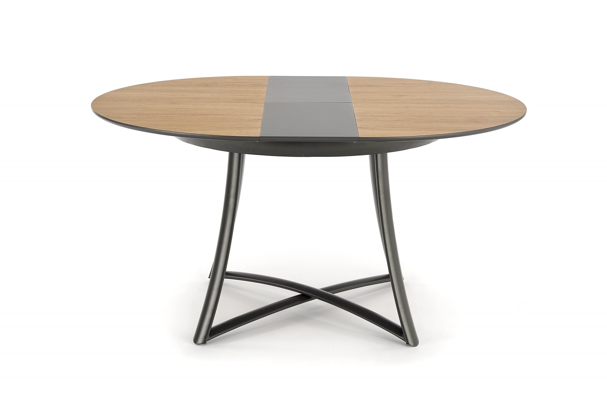 Méretek: 118÷148/118/76 cm, kihúzható asztal, anyag: laminált MDF / lakkozott MDF / porszórt acél, szín: asztallap - arany tölgy / fekete, lábak - antracit.