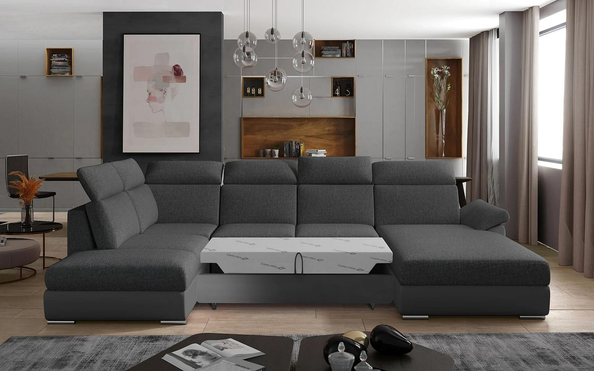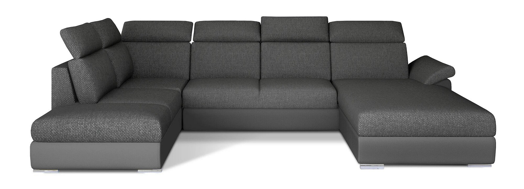 Evanell is a spacious, comfortable and stylish corner sofa that simply impresses - not only with its classic body, which complements the modern finish of the individual elements, but also with the maximum comfort that can be experienced on a sofa measuring 330 x 216 x 102 cm. The Evanell sofa bed will prove ideal as a piece of furniture for daytime relaxation, but can also serve as a place to sleep. The dolphin-type design allows you to quickly and effortlessly adjust the furniture to your current needs, providing a comfortable space for resting at night. The functionality of the furniture is also improved by a capacious storage compartment for bedding, which is located in the ottoman. The seat of the furniture is made of durable corrugated spring and elastic T30 foam, which guarantee exceptional comfort, maximum softness and resistance to indentation. Also worthy of additional distinction in our furniture are the high, contoured backrests, adjustable headrests, slanted armrest, upholstered back of the corner sofa, as well as the availability of the sofa in many color variants. Evanell is a piece of furniture that will meet all your expectations - from admiration of the aesthetic qualities, to maximum comfort of both sofa and bed.