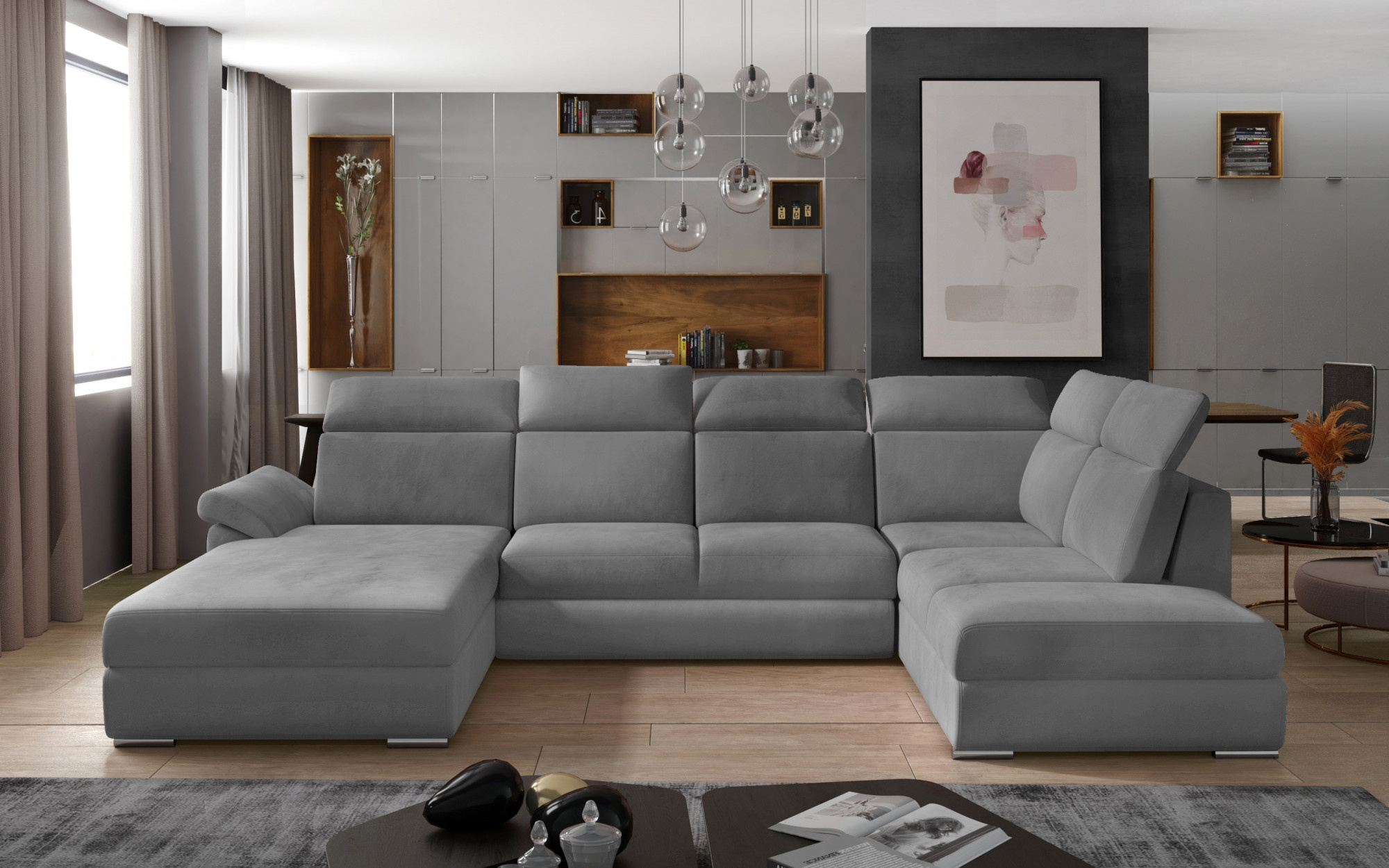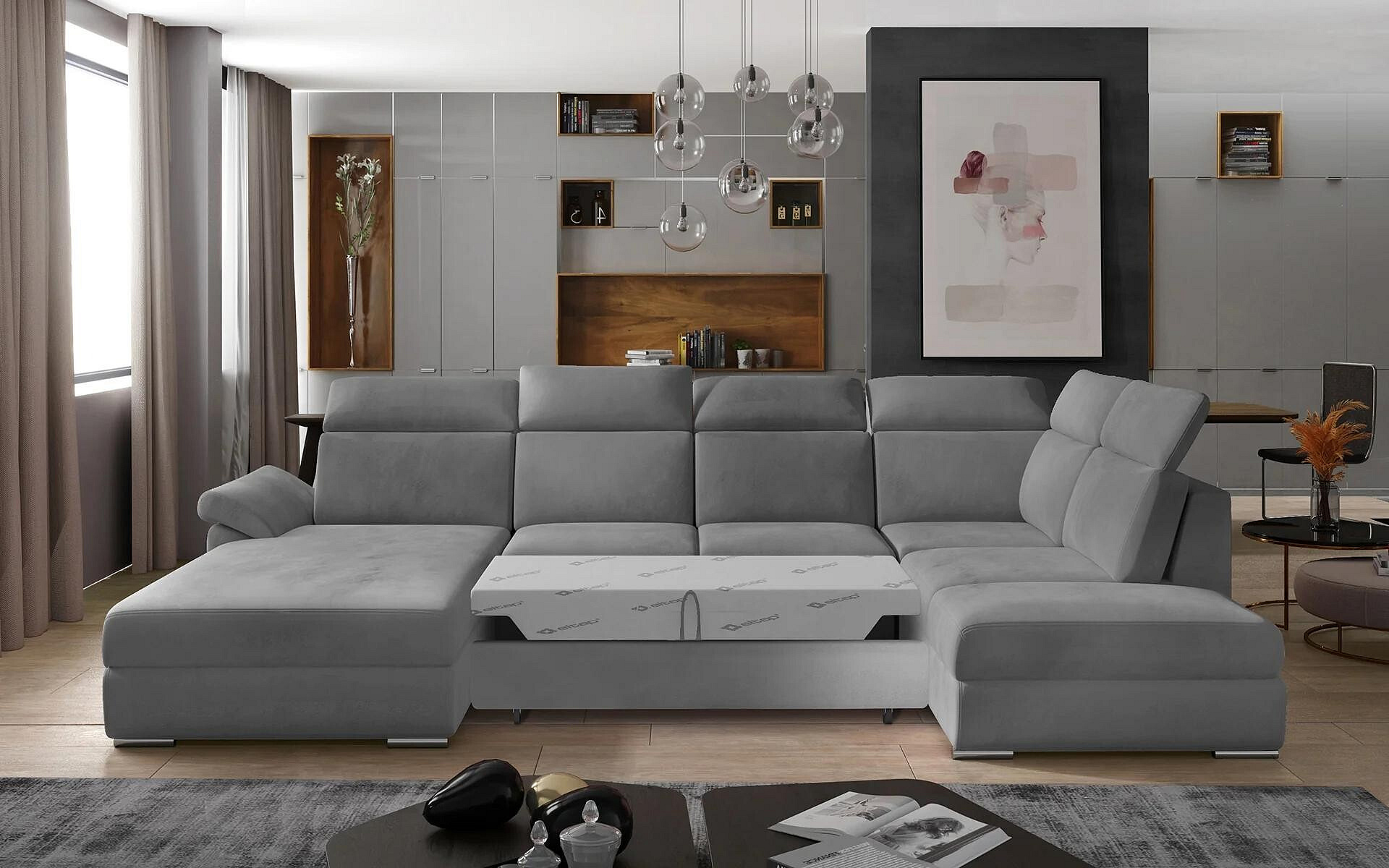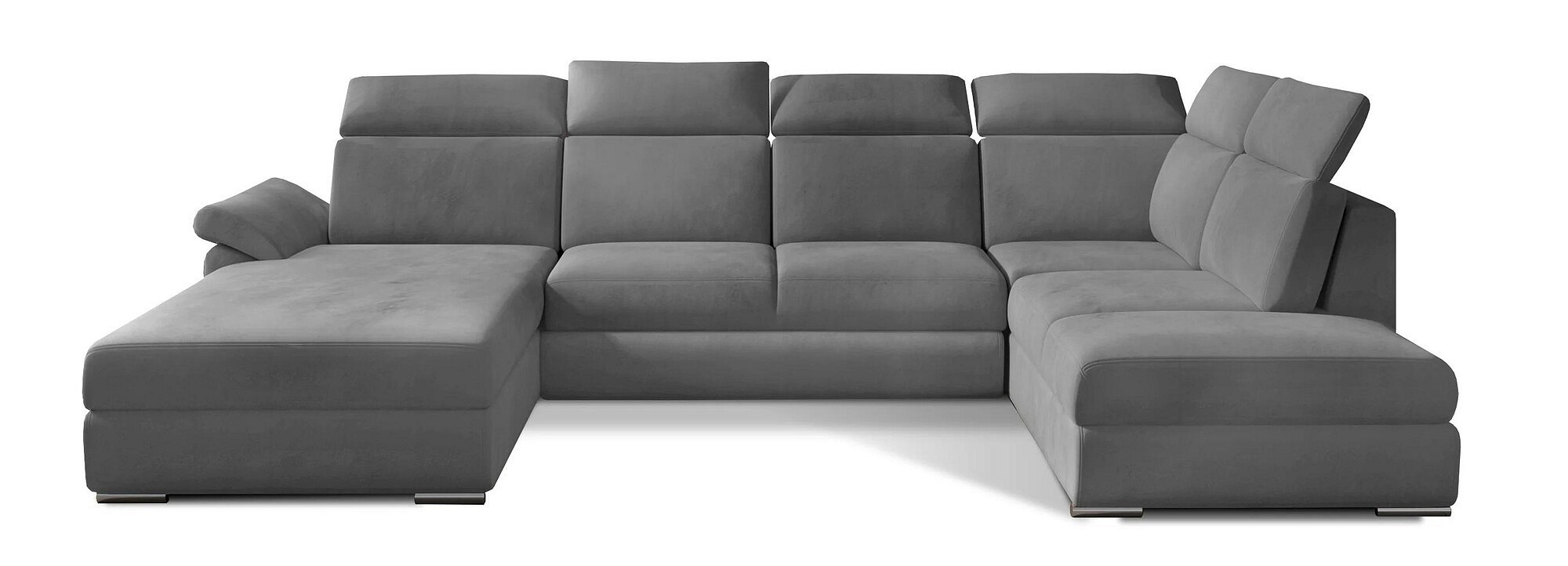 Evanell is a spacious, comfortable and stylish corner sofa that simply impresses - not only with its classic body, which complements the modern finish of the individual elements, but also with the maximum comfort that can be experienced on a sofa measuring 330 x 216 x 102 cm. The Evanell sofa bed will prove ideal as a piece of furniture for daytime relaxation, but can also serve as a place to sleep. The dolphin-type design allows you to quickly and effortlessly adjust the furniture to your current needs, providing a comfortable space for resting at night. The functionality of the furniture is also improved by a capacious storage compartment for bedding, which is located in the ottoman. The seat of the furniture is made of durable corrugated spring and elastic T30 foam, which guarantee exceptional comfort, maximum softness and resistance to indentation. Also worthy of additional distinction in our furniture are the high, contoured backrests, adjustable headrests, slanted armrest, upholstered back of the corner sofa, as well as the availability of the sofa in many color variants. Evanell is a piece of furniture that will meet all your expectations - from admiration of the aesthetic qualities, to maximum comfort of both sofa and bed.
