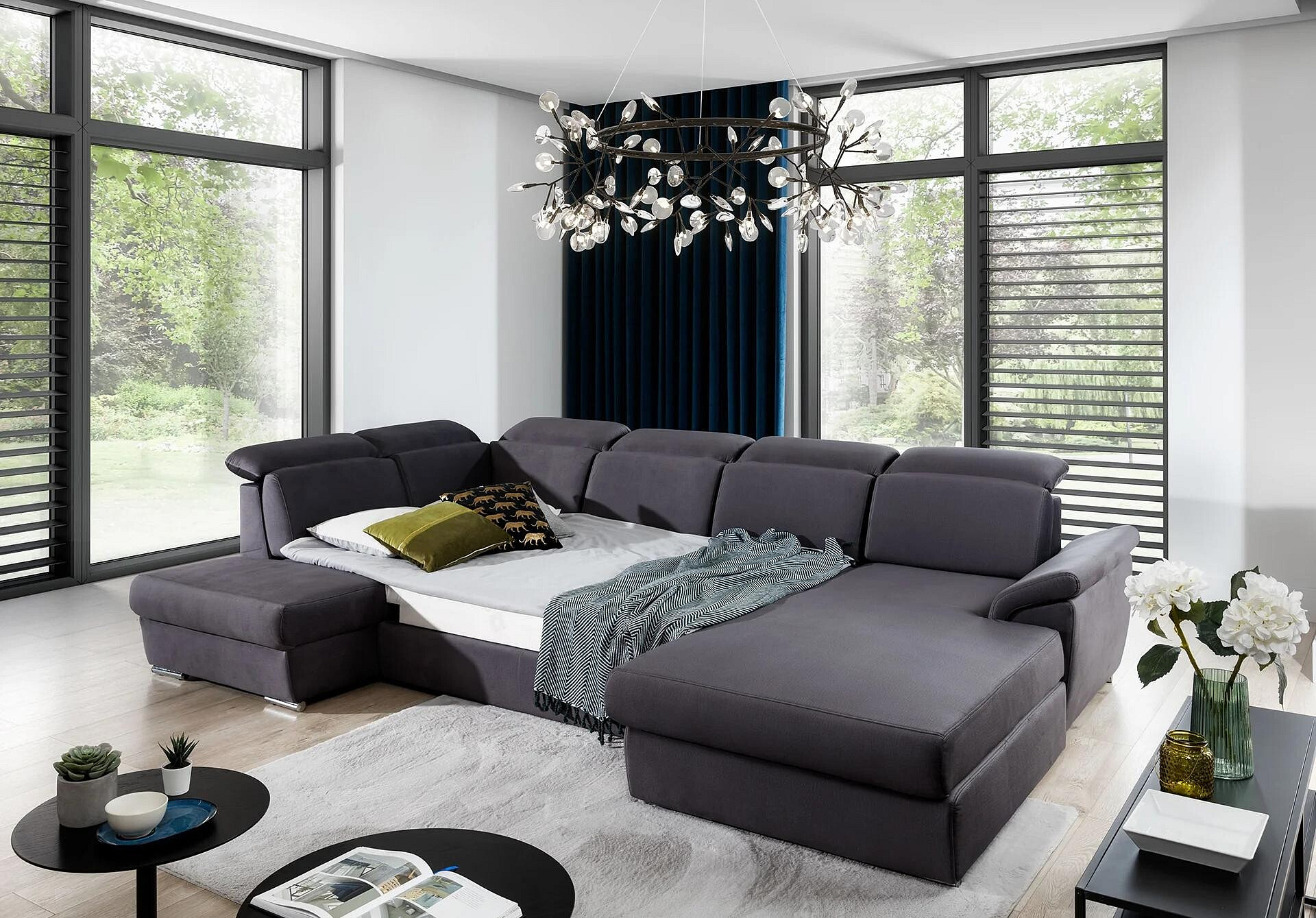Evanell is a spacious, comfortable and stylish corner sofa that simply impresses - not only with its classic body, which complements the modern finish of the individual elements, but also with the maximum comfort that can be experienced on a sofa measuring 330 x 216 x 102 cm. The Evanell sofa bed will prove ideal as a piece of furniture for daytime relaxation, but can also serve as a place to sleep. The dolphin-type design allows you to quickly and effortlessly adjust the furniture to your current needs, providing a comfortable space for resting at night. The functionality of the furniture is also improved by a capacious storage compartment for bedding, which is located in the ottoman. The seat of the furniture is made of durable corrugated spring and elastic T30 foam, which guarantee exceptional comfort, maximum softness and resistance to indentation. Also worthy of additional distinction in our furniture are the high, contoured backrests, adjustable headrests, slanted armrest, upholstered back of the corner sofa, as well as the availability of the sofa in many color variants. Evanell is a piece of furniture that will meet all your expectations - from admiration of the aesthetic qualities, to maximum comfort of both sofa and bed.