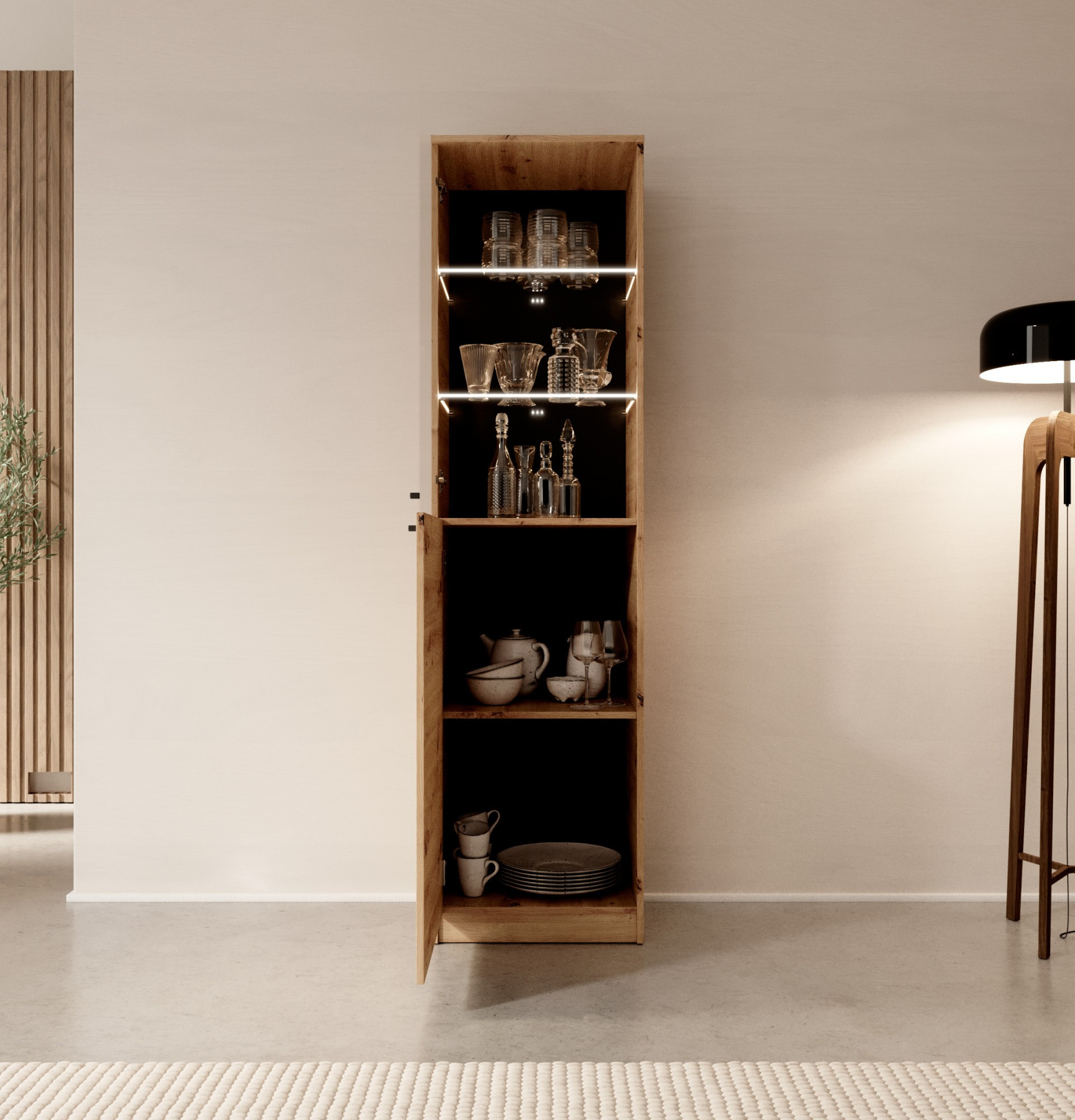 Az Evi II egy elegáns, magas dizájnnal rendelkező vitrin, amelyet az üvegezés jellemez, ami könnyedséget és modernséget kölcsönöz neki. Artisan színe finom, de kifinomult esztétikát kölcsönöz, amely ideálisan illeszkedik számos különböző belső térbe. Ez a vitrin nemcsak praktikus megoldás a tárgyak tárolására és kiállítására, hanem dekoratív elem is, amely stílust és eleganciát kölcsönöz a helyiségnek. Kiváló minőségű kidolgozásának és dizájnos megjelenésének köszönhetően az Evi II tökéletesen illeszkedik mind otthoni, mind irodai vagy üzleti környezetbe.