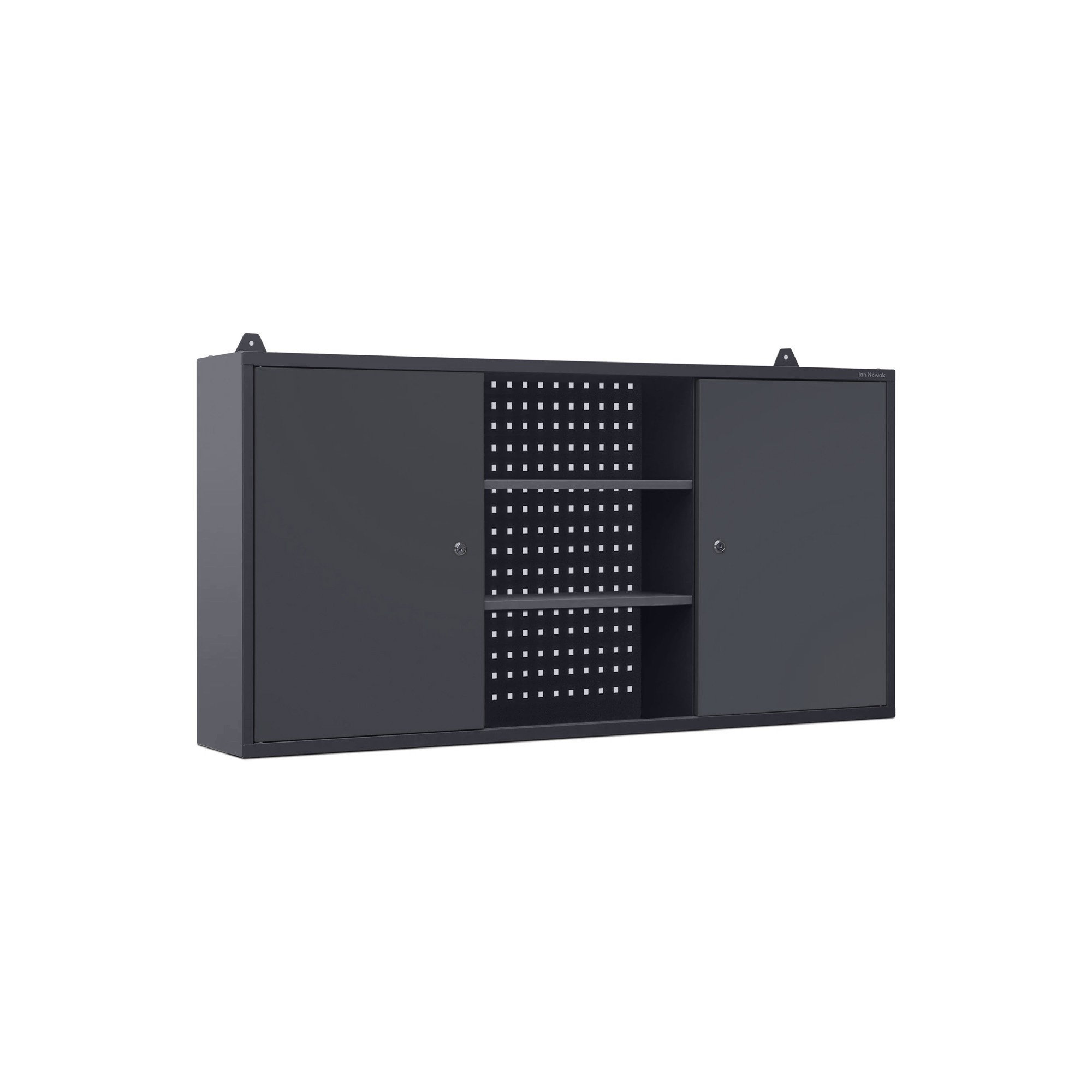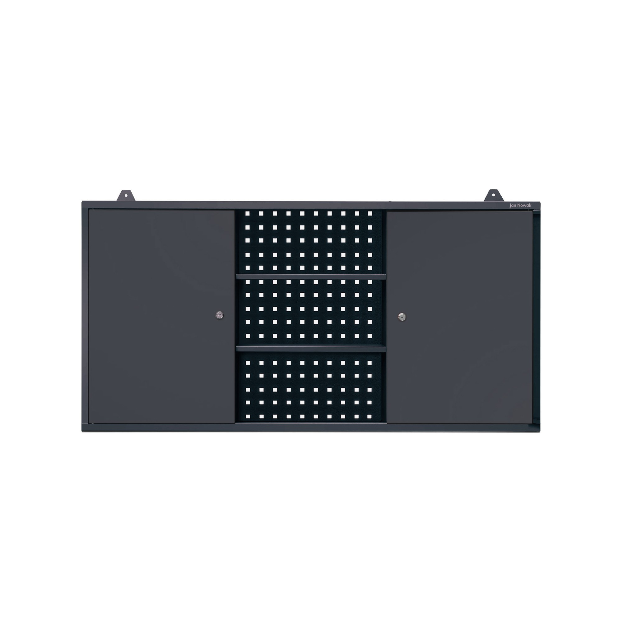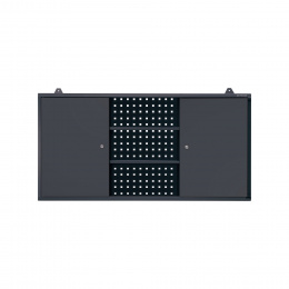 A szekrény három zónára van osztva: két zárható rekesz az oldalakon és egy nyitott tér polcokkal középen. Ez a felosztás lehetővé teszi a különböző méretű szerszámok és tartozékok áttekinthető elrendezését. Zárható rekeszekbe értékes vagy veszélyes tárgyakat helyezhet el, míg a polcokra gyakran használt eszközöket tehet.Perforált lemez a tökéletes szervezésért